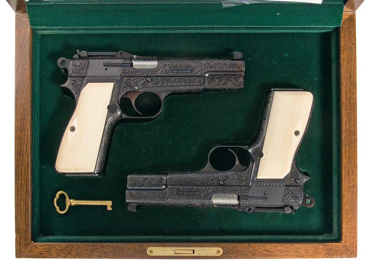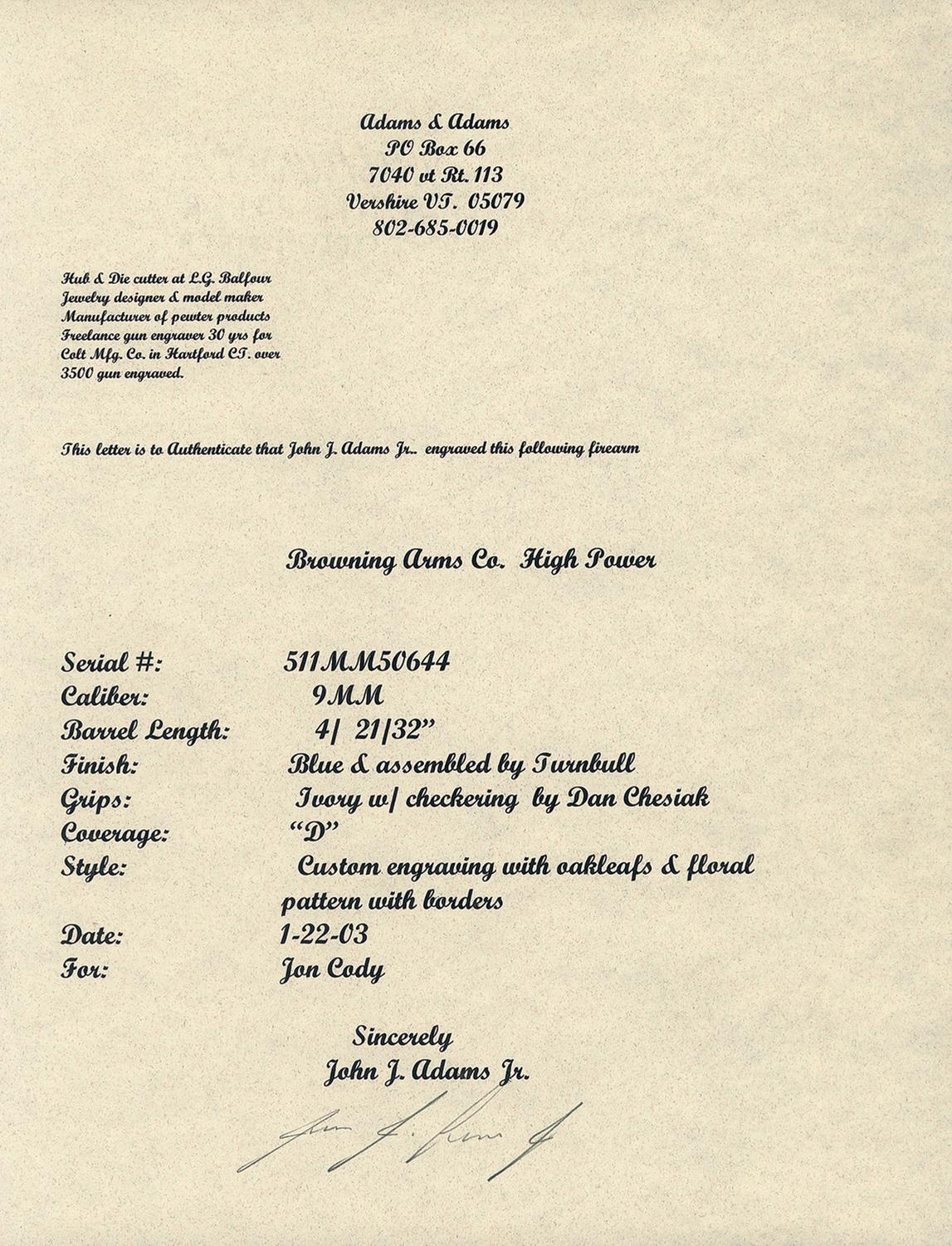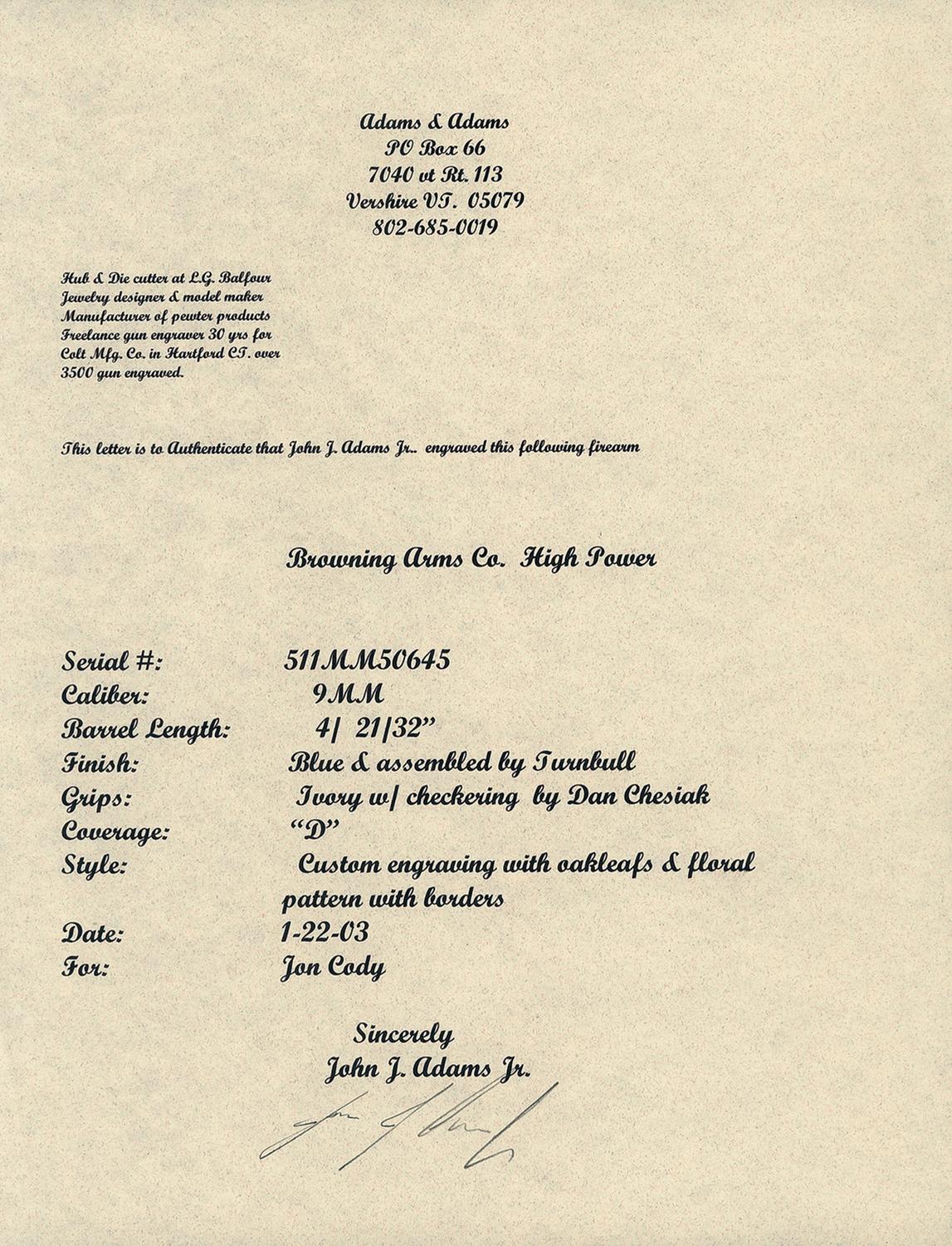 A) This lot consists of two consecutively serialized Browning High Power semi-automatic pistols featuring an identical custom engraving by Master Engraver John J. Adams, Jr. Each pistol comes with a letter of authenticity on Adams & Adams letter head and dated January 22, 2003. The letters confirm the serial number, caliber, and barrel length and state that the pistol features a D coverage oakleaf and floral pattern with border engraving done by John J. Adams, Jr., blued and assembled by Turnbull, and ivory grips checkered by Dan Chesiak. The oak leaf engraving on a punch dot background covers 97% of the metal surfaces. The engraving surrounds the slide markings (FABRIQUE NATIONAL HERSTAL" on the left, "BROWNING S.A. / MADE IN BELGIUM" on the right) and the serial number on the front grip strap. The engraving extends to the magazine floor plate. Jeweled chamber serialized to gun and the backstrap is cut for a stock. Blade front and tangent rear sights. Fitted with checkered ivory grips. Each pistol comes with a Browning plastic case numbered to the gun, a box of Norma 9 mm luger cartridges, papers, and two extra magazines. Complete with a locking wooden presentation case lined in green fitted velvet.