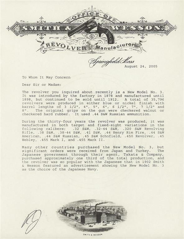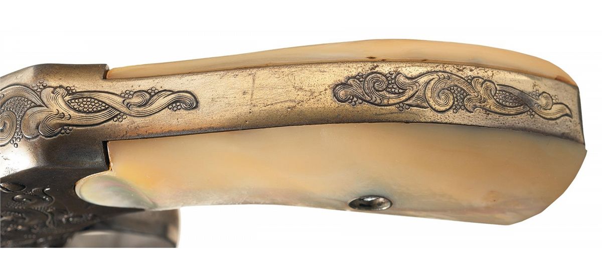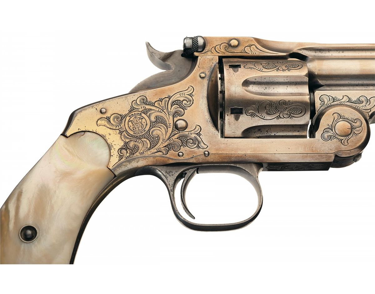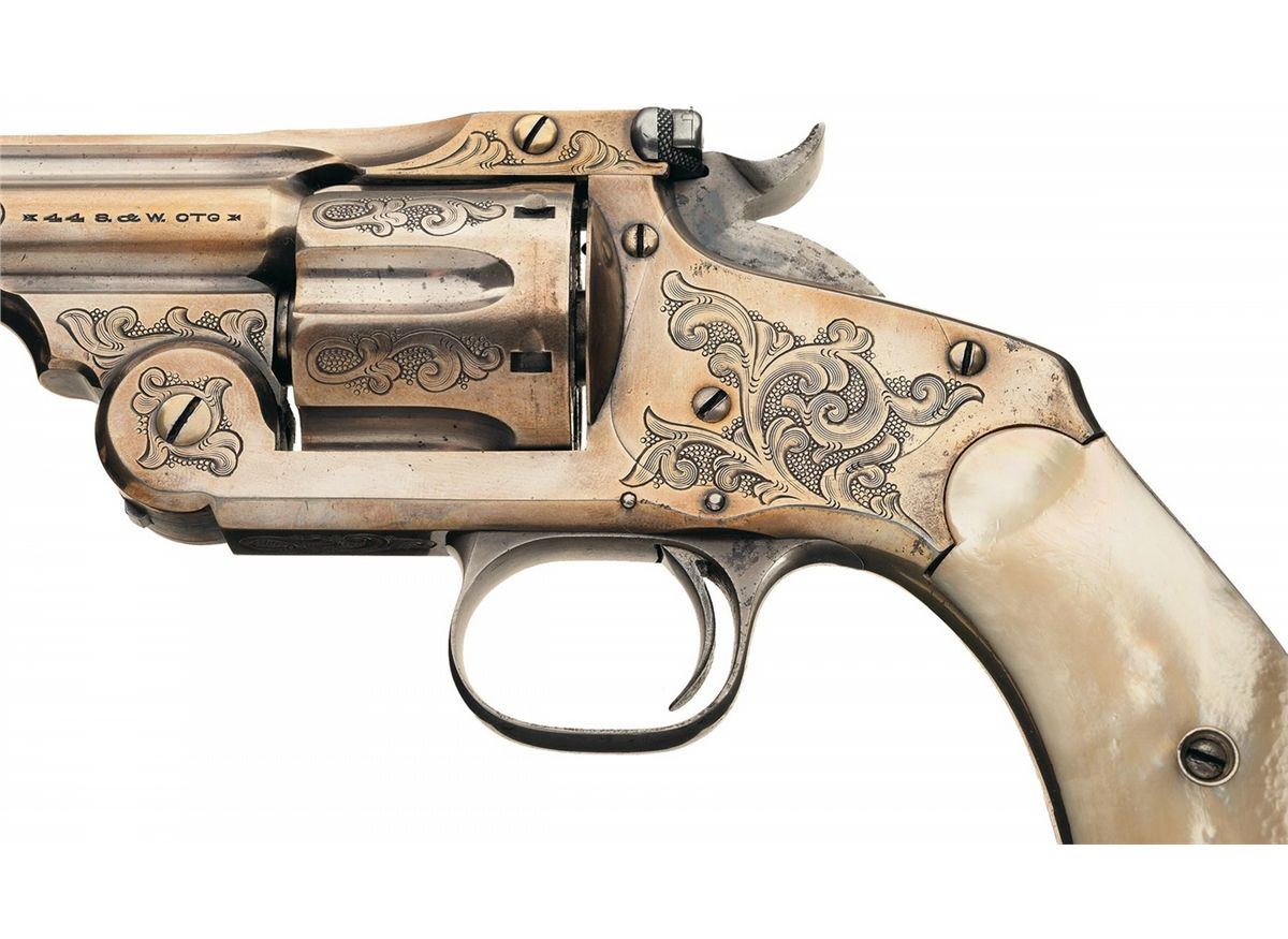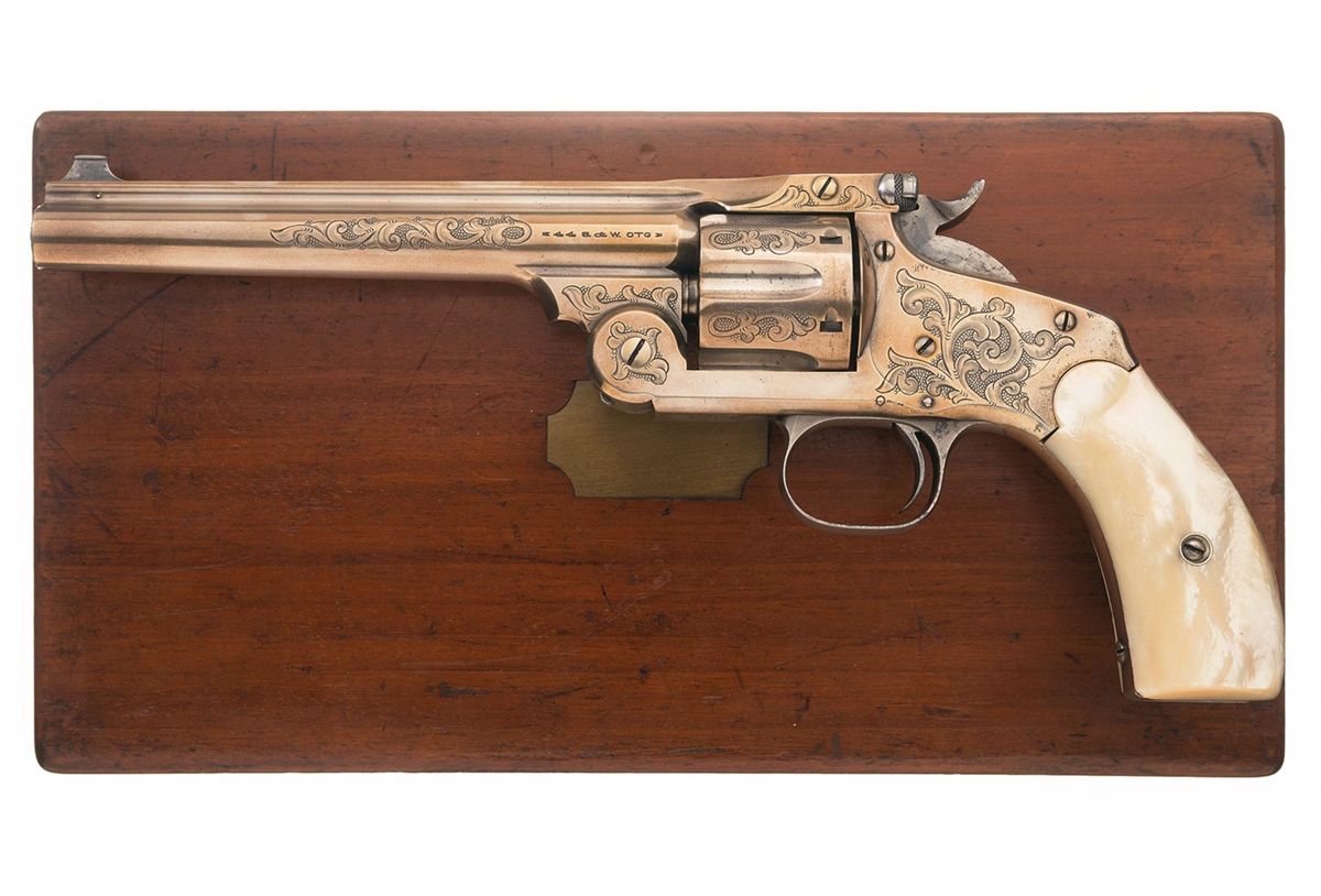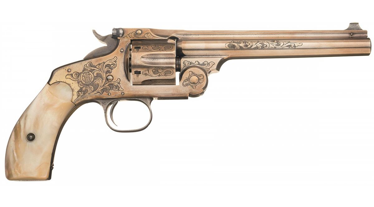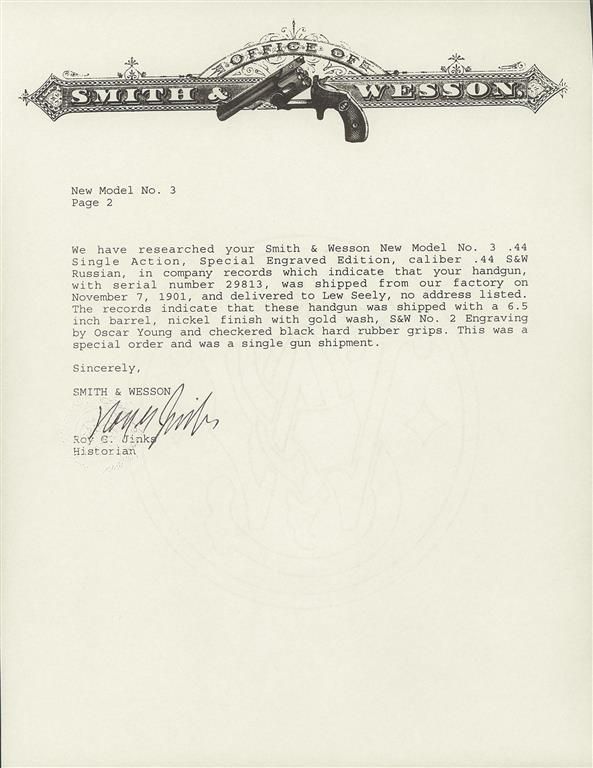 Manufactured in 1901. This revolver features a nickel finish with factory gold wash. The center sides of the barrel, cylinder flats, frame and back strap have floral scroll and punch dot engraving. The top of the barrel rib is marked with the one line address, with "44 S.&W. CTG" flanked by Maltese crosses on the left rear of the barrel, and the matching serial number marked on the butt, rear cylinder face, barrel latch and rear of the top strap. Pinned blade front and notch rear sights, gold washed nickel finish with casehardened hammer and trigger guard, and fitted with smooth two piece pearl grips. The accompanying factory letter verifies the 44 S&W Russian caliber, that it was a "Special Engraved Edition" revolver, the 6 1/2 inch barrel length, gold washed nickel finish, S&W No. 2 engraving done by Oscar Young and it had checkered hard rubber grips at the time of shipment. The revolver was a special order, single gun shipment to Lew Seely, no address listed. Comes in a mahogany case with inset brass plaque on the lid and red velvet lining.