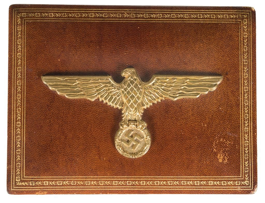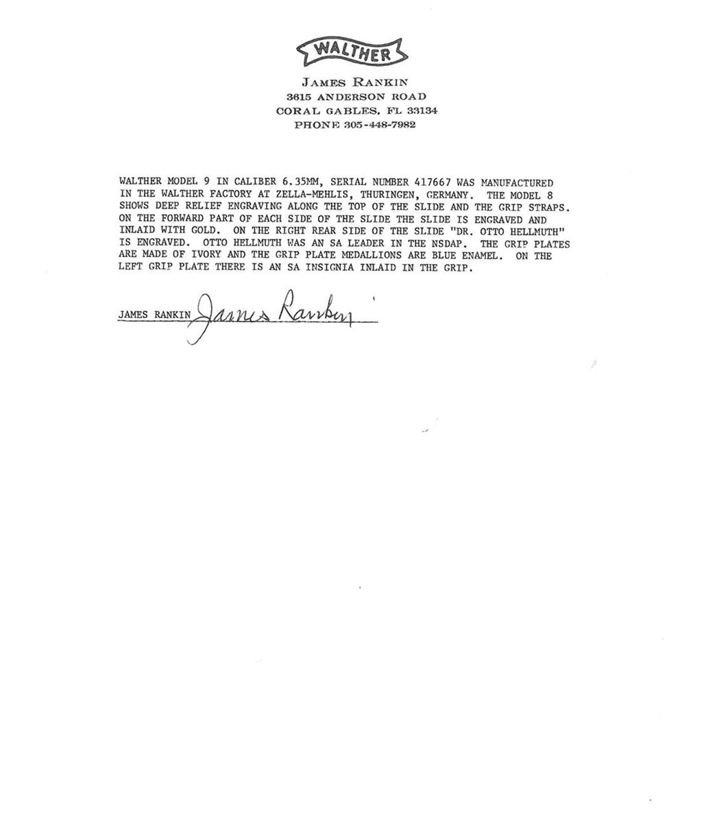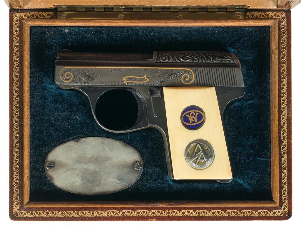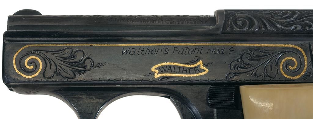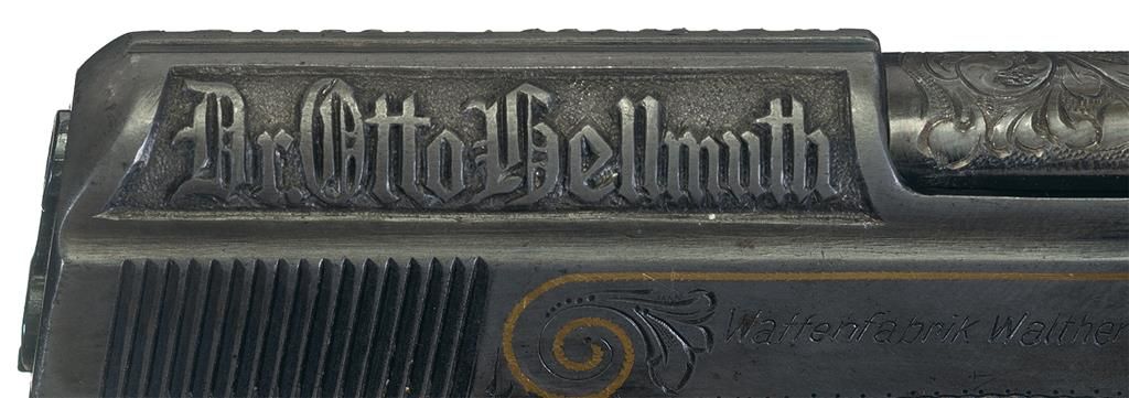 This is an example of a beautiful Walther Model 9 pistol, custom engraved with gold line borders and ivory grips. Presented to "Dr. Otto Hellmuth". The ivory grips have the early blue enameled grip insert with the initials "CW" in the center (for Carl Walther) that has also been fitted with a silver "SA" emblem on the lower left side. Dr. Otto Hellmuth was originally born on July 22, 1896 and entered service as a war volunteer and was assigned to Infantre-Regiment 4; during World War I he was wounded four times and left service in 1918. He joined the Nazi Party in the late 1920s and was eventually appointed as the Gauliter of Lower Frankonia. He survived the war, was tried as a War Criminal at Dachau, in 1947, and was sentenced to death, however his sentence was commuted to life in prison. He was released in 1955 and died in 1968. The pistol is engraved in an early factory pattern that features a fine scroll engraving with a fine gold line border around the "WALTHER" name and the edges of the slide on each side. The right rear end of the slide is heavily/deeply engraved with "Dr. Otto Hellmuth", in a Germanic style lettering. The left side of the slide has a one-line "Walther's Patent MOD. 9" markings over the Walther banner with the right side having the single Walther's address markings. The serial number "417667" is located on the rear section of the frame behind the grips. It has the standard blade front and grooved slide rear sight notch. As noted it has original and very rare original Walther factory, smooth ivory grips with the Walther blue enameled inserts on each sides one with: "CW" logo and "6.35" with the silver "SA" emblem on the left side. This pistol is complete with the magazine which has an engraved base plate also with a gold border. This exceptional pistol is complete with an original brown russet leather presentation case with a large Gold Nazi eagle inset on the top of the lid with a blue velvet liner. The lower left edge on the inside of the replacement case has a small oval silver disc. With a copy of a letter from noted author James Rankin, which verifies the model and configuration. It does not state the additional features are Walther work.