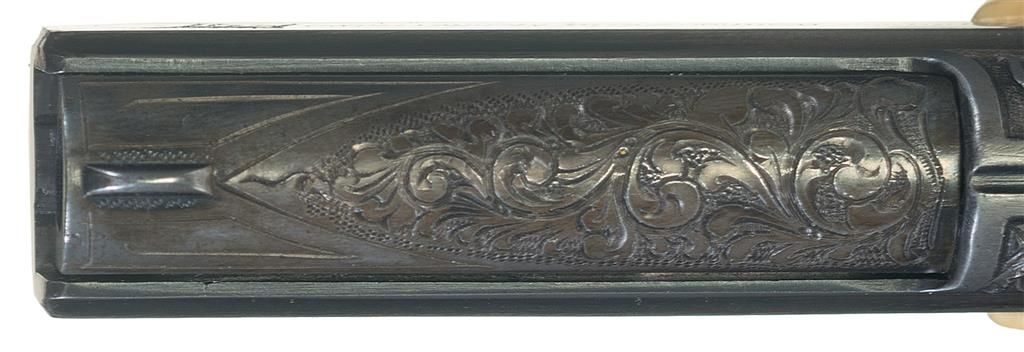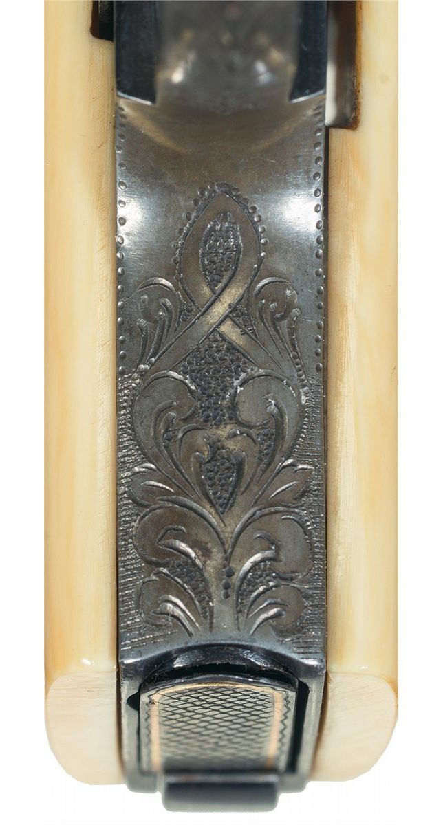 Fine as partially refurbished with 50% of the blue remaining on the frame of the pistol with the slide having been professionally refinished at some point which has now taken on a aged gray patina look. The engraving and gold line borders are all in excellent condition. The ivory grips are excellent condition with a nice aged yellow look. The Walther factory blue enameled disc and the larger "SA" emblem are very fine, but does show wear across the top of emblem as it sits slightly higher than the left grip. The custom made presentation case is also fine with minimal wear on the outside with the blue lining intact. An interesting, undocumented Walther No. 9 semi-automatic pistol.
