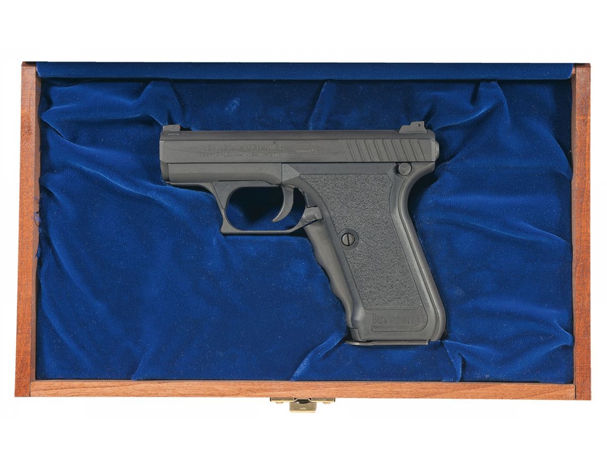 Introduced in 1976 and updated in the 1980s to include an ambidextrous magazine catch, the P7's "Squeeze Cocker" single action operation remains unique among modern handguns. Adjustable 3-dot sights, with the "007" serial number on the slide and frame. Fitted with textured black grips. In a blue felt lined hardwood case.