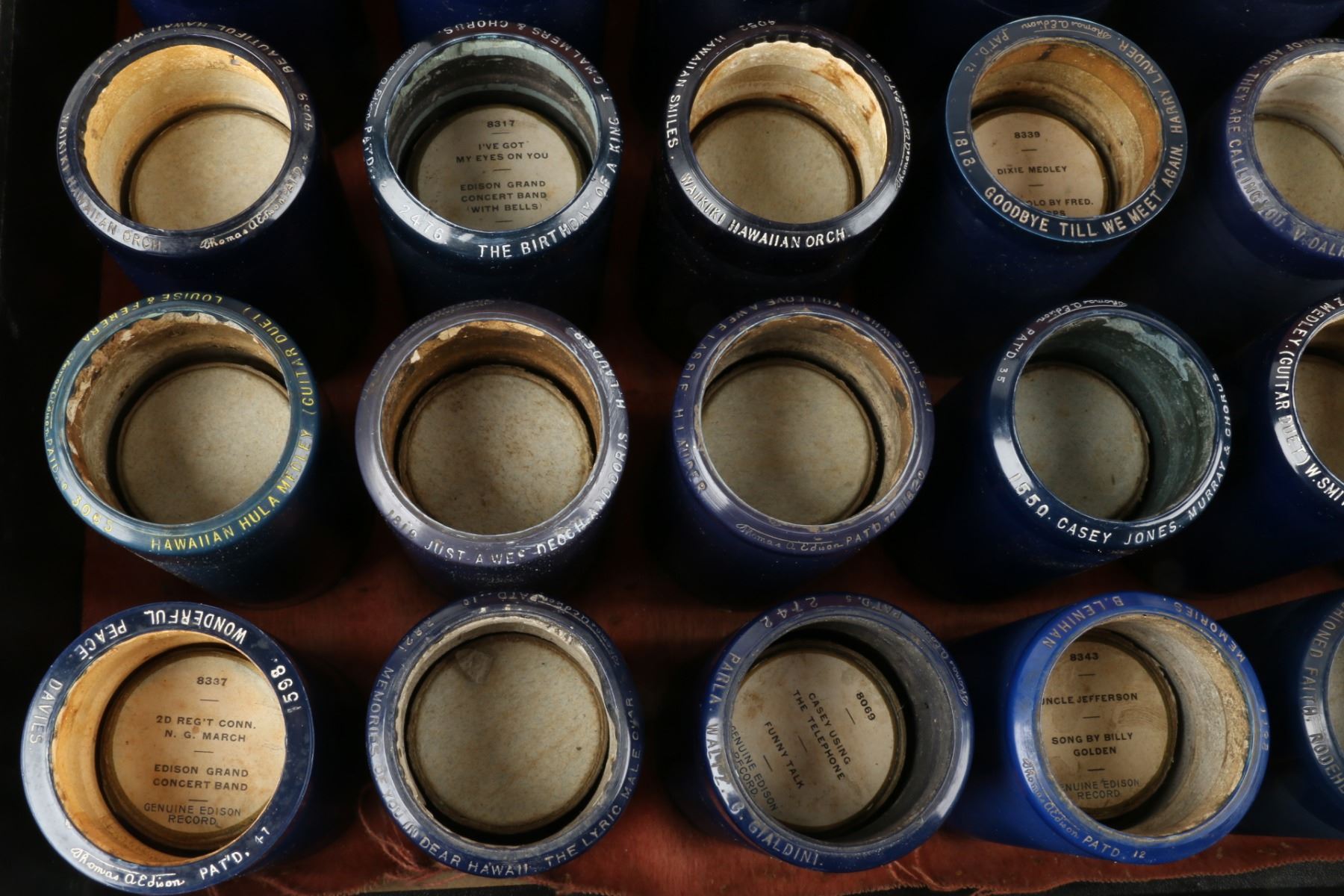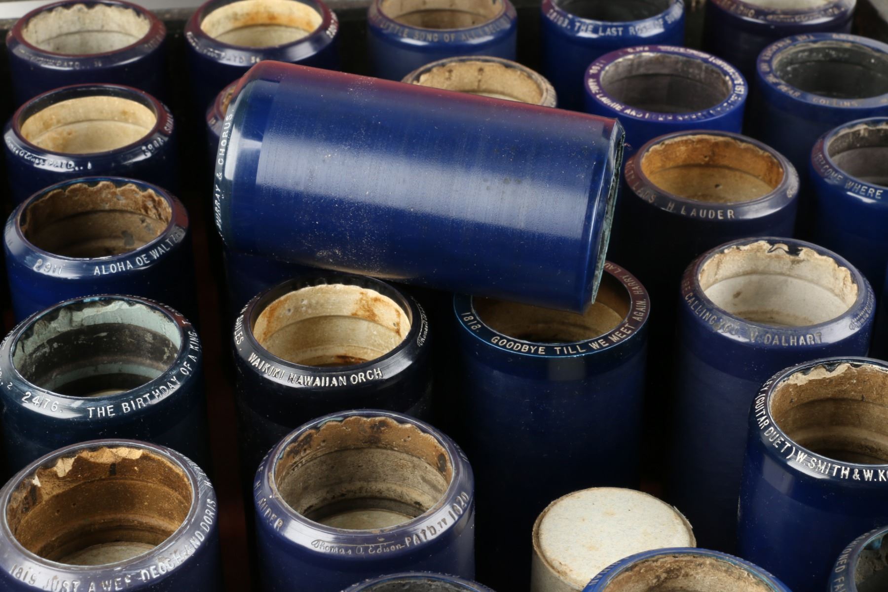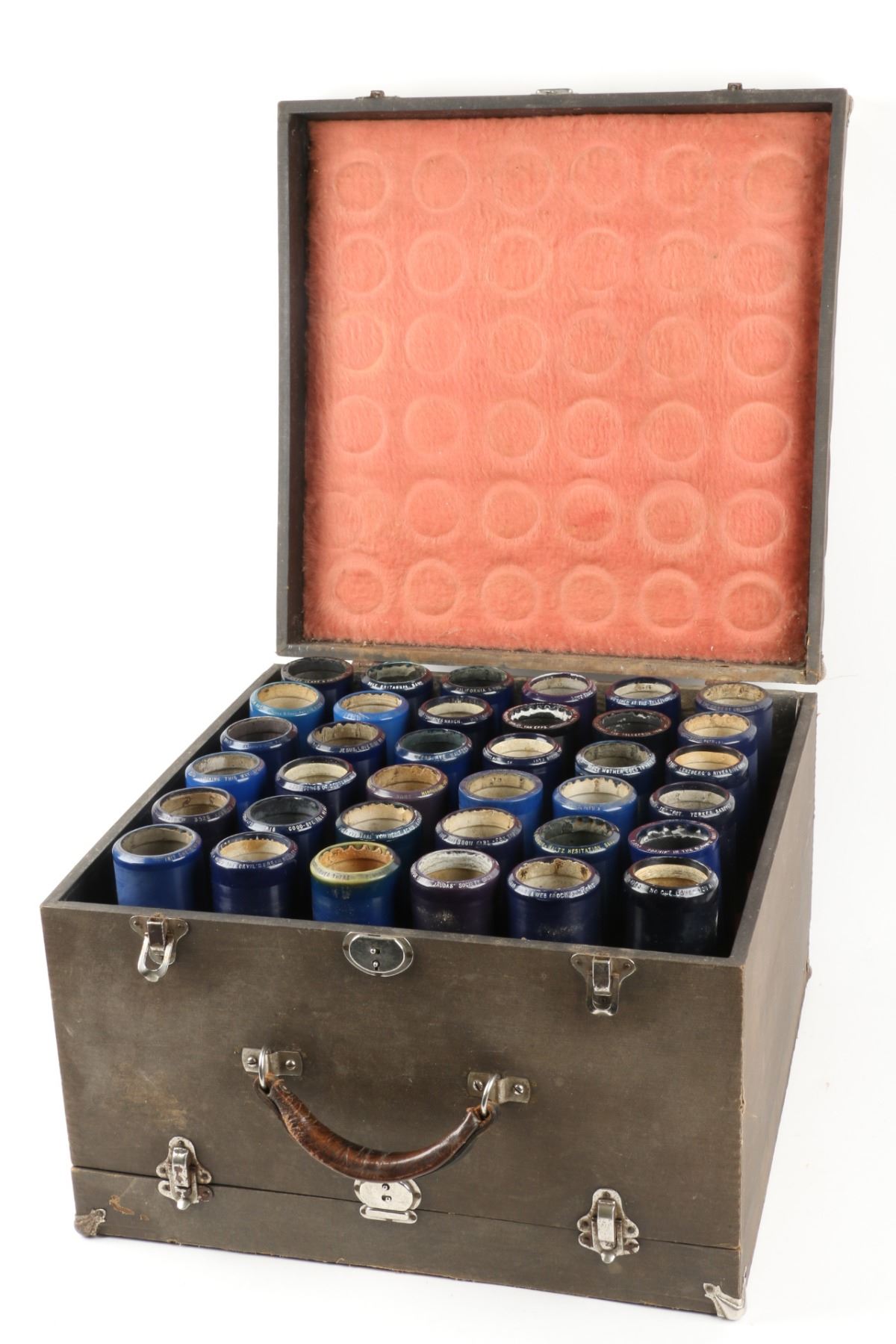 72 Edison blue Amberol 4 minute cylinder records in original carrying case. Each record labelled. Cylinders untested. Case measures 17" x 16" x 11". Stain and tears to cloth outer of case. $200-300.