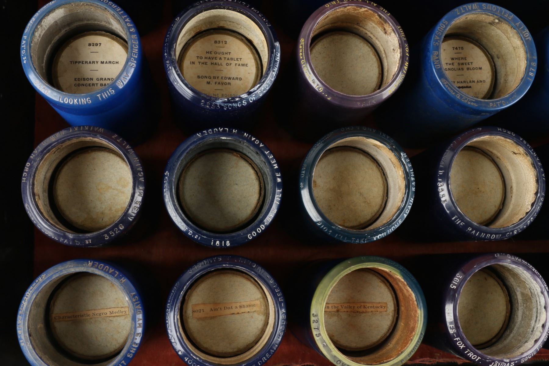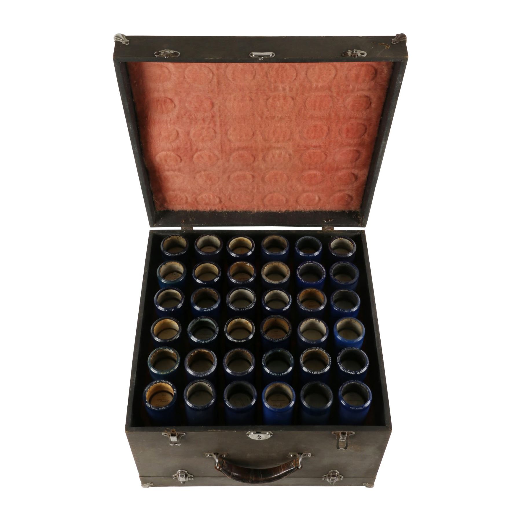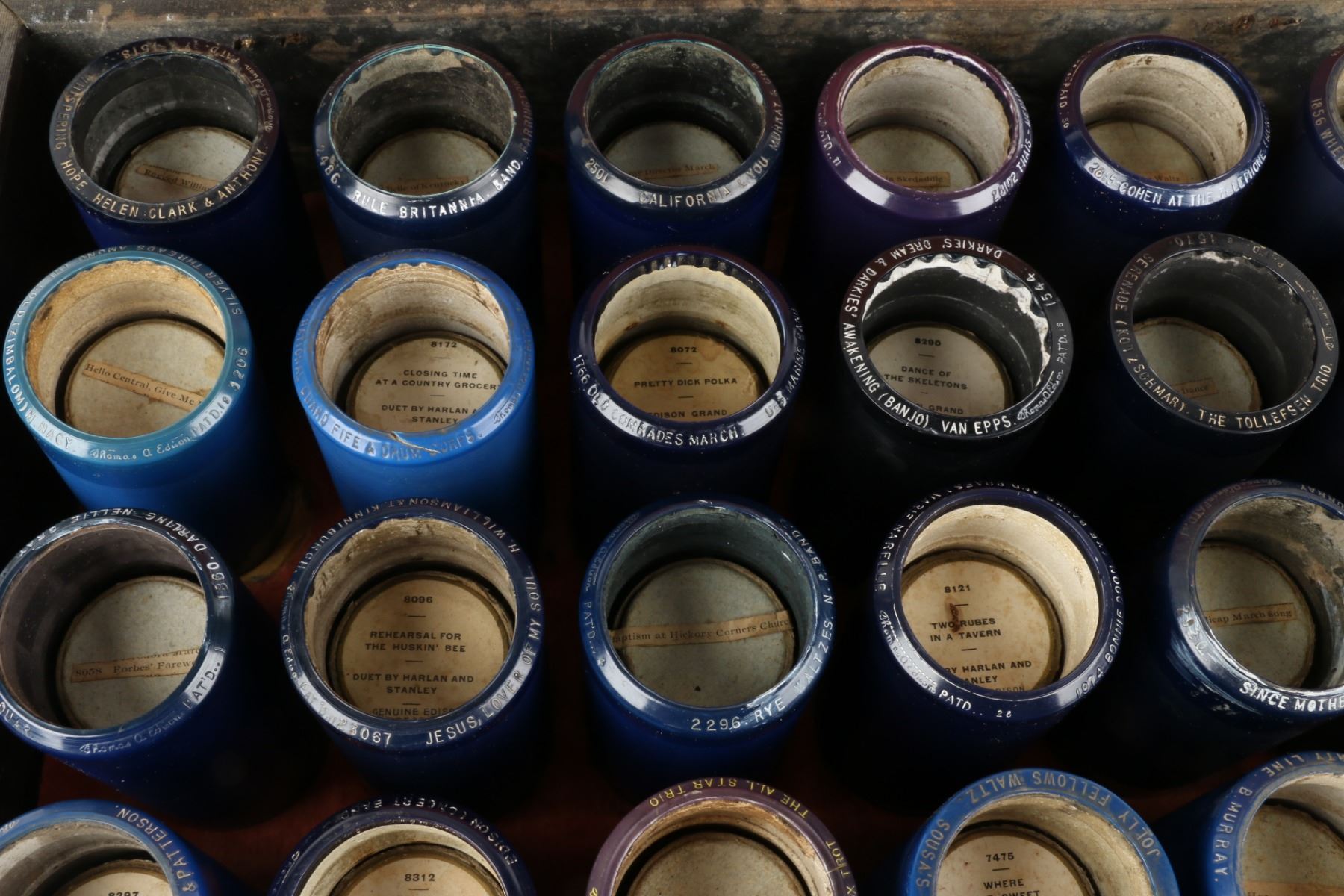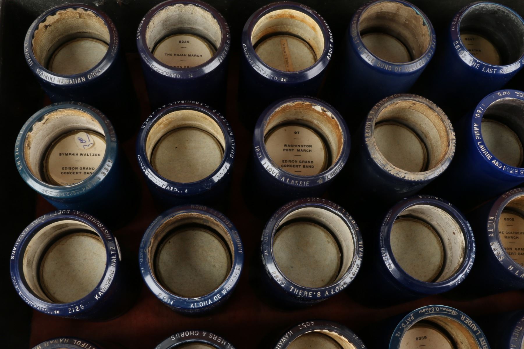 72 Edison blue Amberol 4 minute cylinder records in original carrying case. Each record labelled. Cylinders untested. Case measures 17" x 16" x 11". Stain and tears to cloth outer of case. $200-300.