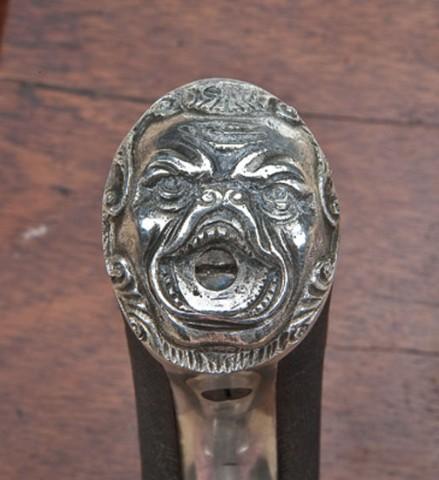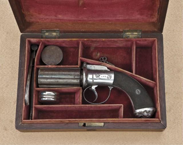 Cased English pepperbox pistol , .36 caliber, 6-shot, 8-1/2” overall, silver plated over cast-metal frame, nicely checkered wood grips with silver plated grotesque butt cap reminiscent of an earlier era. The barrel group show case hardened finish. The left side of the frame is hand-stamped in an engraved cartouche E.V.S. The barrels show 30-50% case hardening drifting at the edges and bright at the flutes. There is some slight erosion and pinprick pitting. And some slightly heavier pitting at the breech and firing areas. The frame shows 98% of a very heavy original silver plate. The checkered wood grips are very good plus and just slightly dark from oil and handling. The trigger and trigger guard have gone to grey with slight erosion and normal aging. The hammer shows 50-60% case hardening. The action is tight and the pistol is working well. The pepperbox is contained within its original to the period partition style case with close contours. The interior of the case is very good with some slight fraying, losses, fading, etc. An original case hardened mold and combination loader is included with 75-85% case hardening and definitely made for this compartment. A working