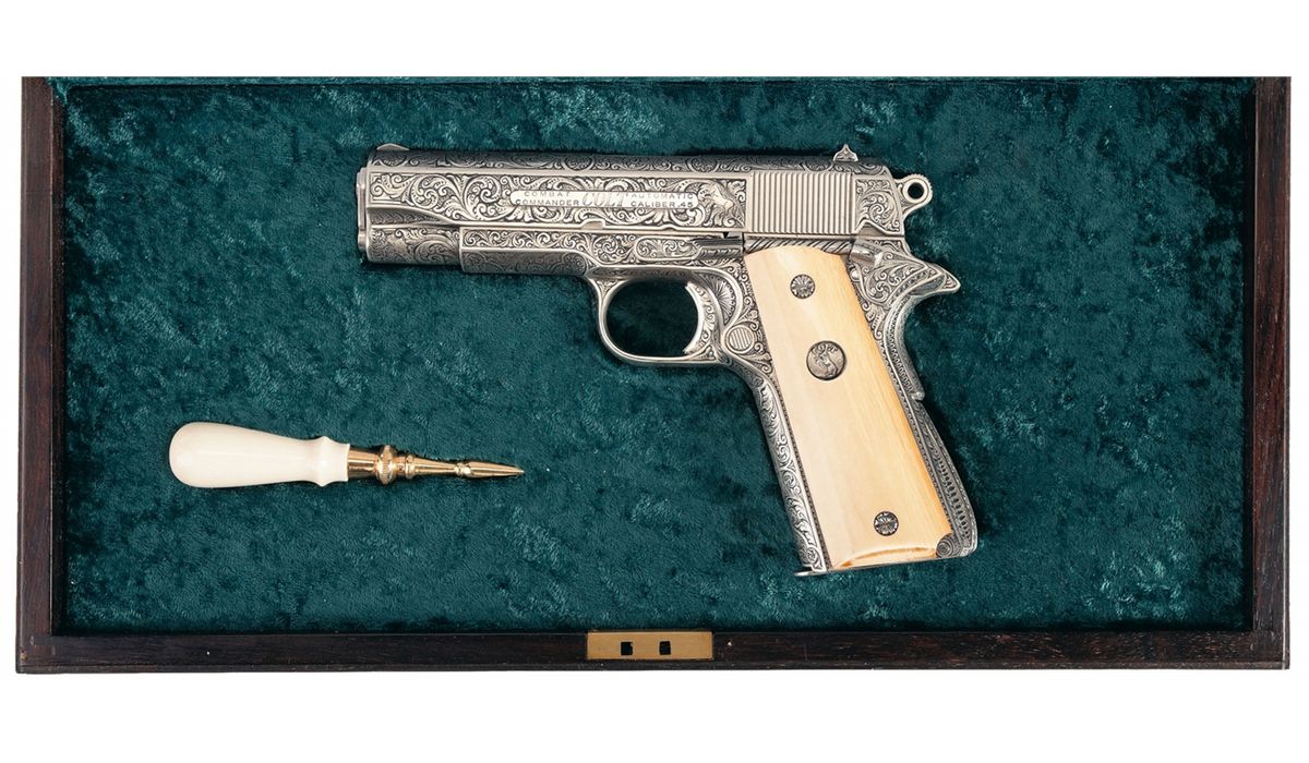 Manufactured in 1978, with almost full floral scroll engraving. The inside of the trigger guard, magazine release, barrel, barrel bushing and recoil spring plug are the only external components lacking engraving. Fitted with ivory Colt medallino grips. With a hardwood display case lined with green fabric, an extra set of ivory grips and an ivory handled gilt screwdriver.