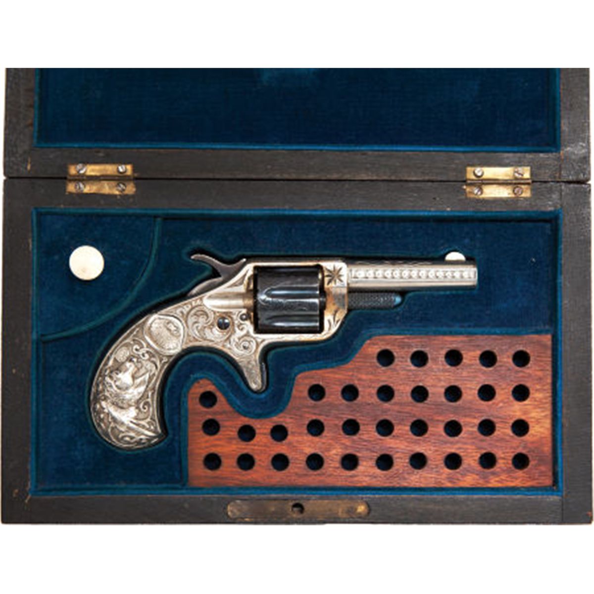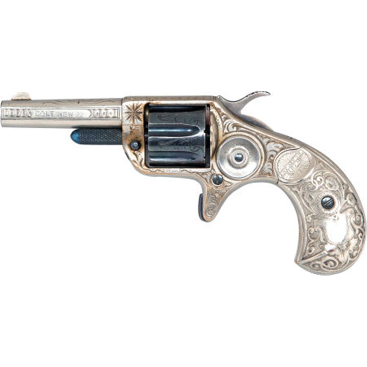 Cased Engraved Colt New Line 22 Pocket Revolver. .22 caliber, Serial no. 1463, .22 caliber, 2 1/4-inch octagonal barrel, the left side with etched legend: Colt New 22. Scroll-engraved frame and Wexell & DeGress patented deep relief cast bird's head grips with horsehead motif, the left one marked: Pat Apr. 28/1874. Nickel-plated finish. Blued 7-shot cylinder. Fire-blued screws and knurled cylinder pin. Spur trigger. Case-hardened hammer[see The Book of Colt Firearms, by Sutherland and Wilson, page 299-300 for discussion of this model].Condition: Excellent. Retaining approximately 80-85% finish with wear to frame in front of cylinder and some relief edges. Case-hardening with some fading. Grips excellent. Action excellent.