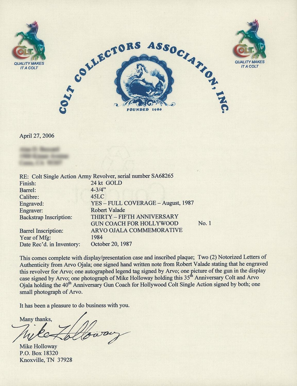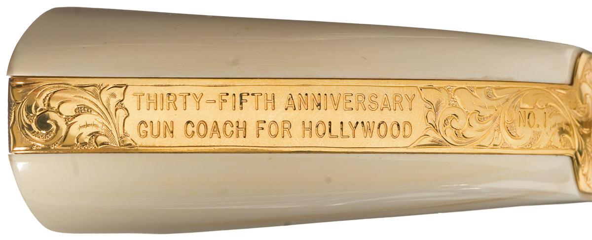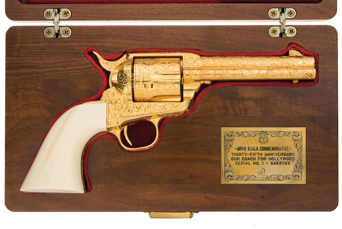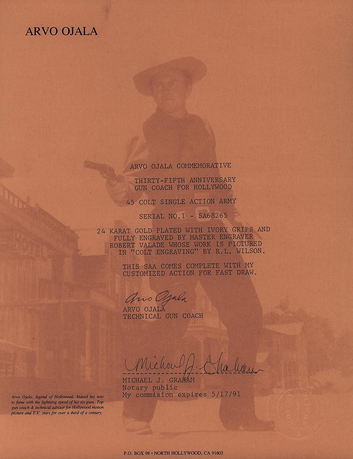 Manufactured in 1984, this revolver commemorates the 35th Anniversary of Arvo Ojala as the "Gun Coach For Hollywood". Arvo Ojala was the worlds fastest draw and technical advisor to motion pictures and television. The revolver is completely finished in 24 carat gold and has full coverage of floral scroll and punch dot engraving done by Master Engraver Robert Valade. In addition to the standard barrel and frame markings, the right side of the barrel is engraved "ARVO OJALA COMMEMORATIVE" and the backstrap is engraved "NO.1" at the top and below that "THIRTY-FIFTH ANNIVERSARY / GUN COACH FOR HOLLYWOOD". The bottom of the frame above the serial number is signed "Valade". The revolver is fitted with a one piece smooth ivory grip. The revolver is equipped with a special customized action for the fast draw. The hammer spur is curved to the right and it feels as if the hammer spring has been lightened. The revolver is accompanied by a Colt Collectors Association letter dated April 27, 2006, verifying the 24 carat gold finish, barrel length, engraving and engraver, barrel and backstrap inscriptions, date of manufacture and a number of items that accompanied the gun at the top the letter was written. Also with the revolver the presentation case with inscribed commemorative plaque and red fitted lining, two Arvo Ojala signed typed and notarized letters, a hand written letter dated December 15, 1994 from Robert Valade stating that his records indicate that he engraved this revolver the 8th month of 1987, Ojala's book "The Secrets of The Fast Draw" and a Ojala autographed photo of this revolver.