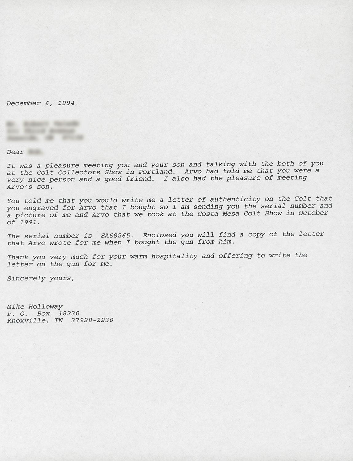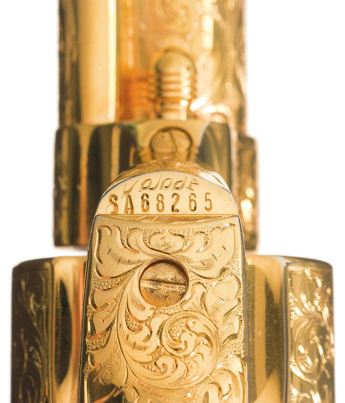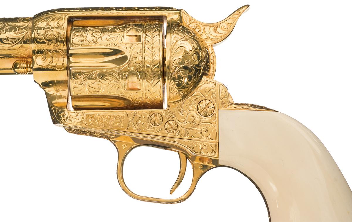 Manufactured in 1984, this revolver commemorates the 35th Anniversary of Arvo Ojala as the "Gun Coach For Hollywood". Arvo Ojala was the worlds fastest draw and technical advisor to motion pictures and television. The revolver is completely finished in 24 carat gold and has full coverage of floral scroll and punch dot engraving done by Master Engraver Robert Valade. In addition to the standard barrel and frame markings, the right side of the barrel is engraved "ARVO OJALA COMMEMORATIVE" and the backstrap is engraved "NO.1" at the top and below that "THIRTY-FIFTH ANNIVERSARY / GUN COACH FOR HOLLYWOOD". The bottom of the frame above the serial number is signed "Valade". The revolver is fitted with a one piece smooth ivory grip. The revolver is equipped with a special customized action for the fast draw. The hammer spur is curved to the right and it feels as if the hammer spring has been lightened. The revolver is accompanied by a Colt Collectors Association letter dated April 27, 2006, verifying the 24 carat gold finish, barrel length, engraving and engraver, barrel and backstrap inscriptions, date of manufacture and a number of items that accompanied the gun at the top the letter was written. Also with the revolver the presentation case with inscribed commemorative plaque and red fitted lining, two Arvo Ojala signed typed and notarized letters, a hand written letter dated December 15, 1994 from Robert Valade stating that his records indicate that he engraved this revolver the 8th month of 1987, Ojala's book "The Secrets of The Fast Draw" and a Ojala autographed photo of this revolver.