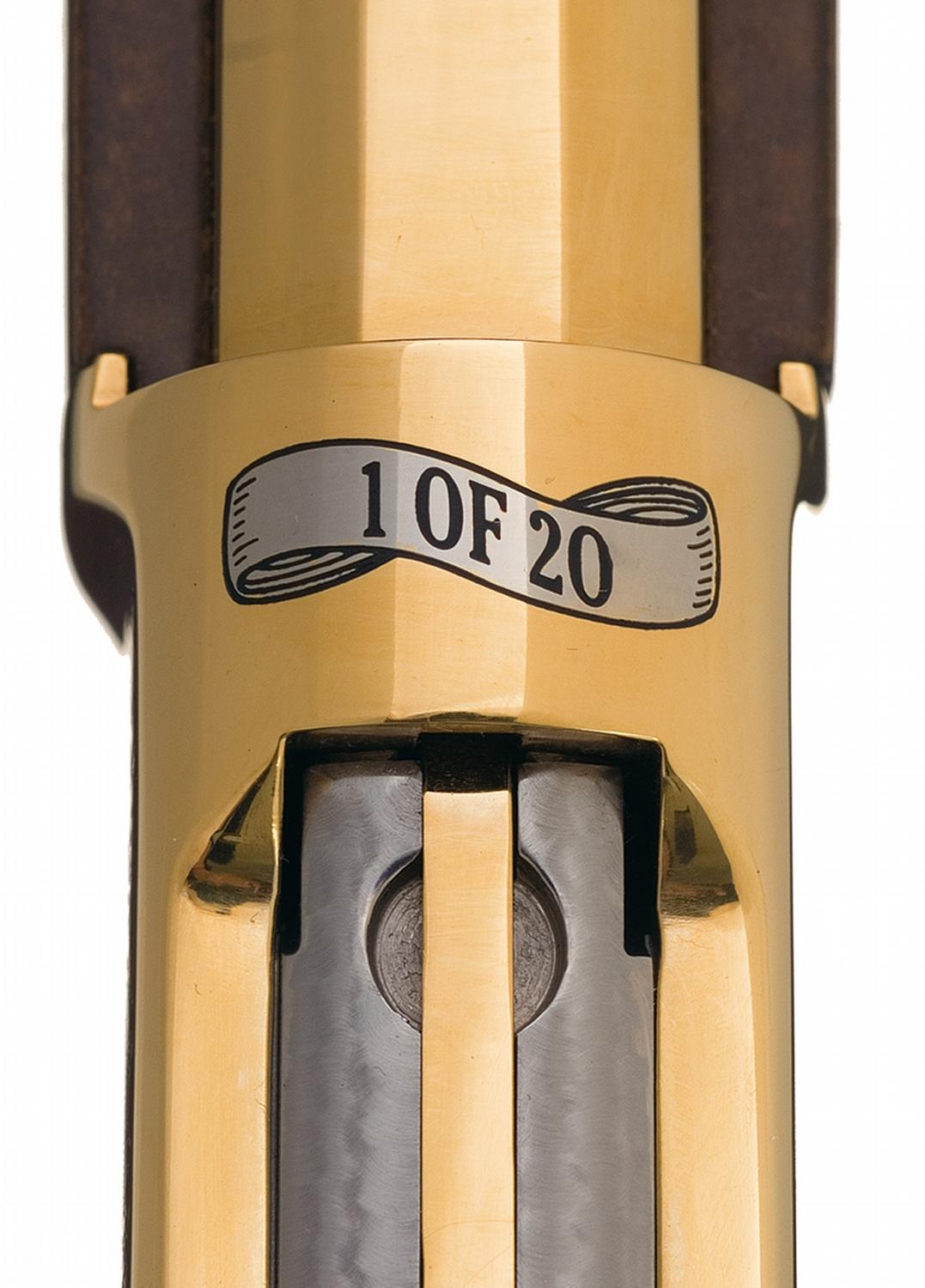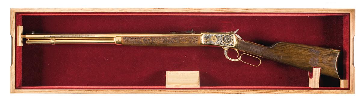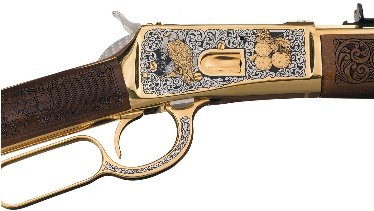 This rifle commemorates the American Legion Department of Florida. The rifle is finished in 24 Karat gold plating with nickel accents. The receiver is engraved with floral scroll patterns with a black background. The left side is also adorned with an American and State of Florida crossed flags and the logo of the American Legion. The right side has a clump of oranges and an American Bald Eagle. The receiver ring has a nickel banner which reads "1 OF 20". Each side of the barrel has a panel which reads "THE AMERICAN LEGION DEPARTMENT OF FLORIDA". The top of the barrel is marked "HARTFORD" ahead of the rear sight and ".45 COLT" on the left upper rear flat. The rifle is mounted with deluxe high gloss forearm and straight grip stock with a crescent buttplate. The wood is carved with various game animals, an outline of Florida and military scenes. The engraving was created and done by A&A Engraving Inc. of Rapid City, South Dakota. Only 21 of these rifle were made, 1 artist proof and 20 commissioned. The rifle comes with a certificate certifying this rifle (number 1) officially issued by A&A Engraving, Inc. of Rapid City, South Dakota. The rifle is complete in a plexiglass top light walnut case with wine colored lining and brass commemorative plaque, and a Plano Protector hard case.