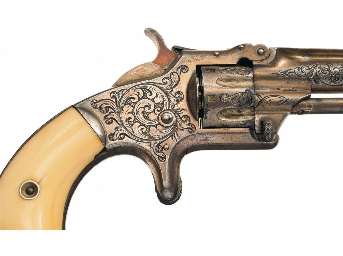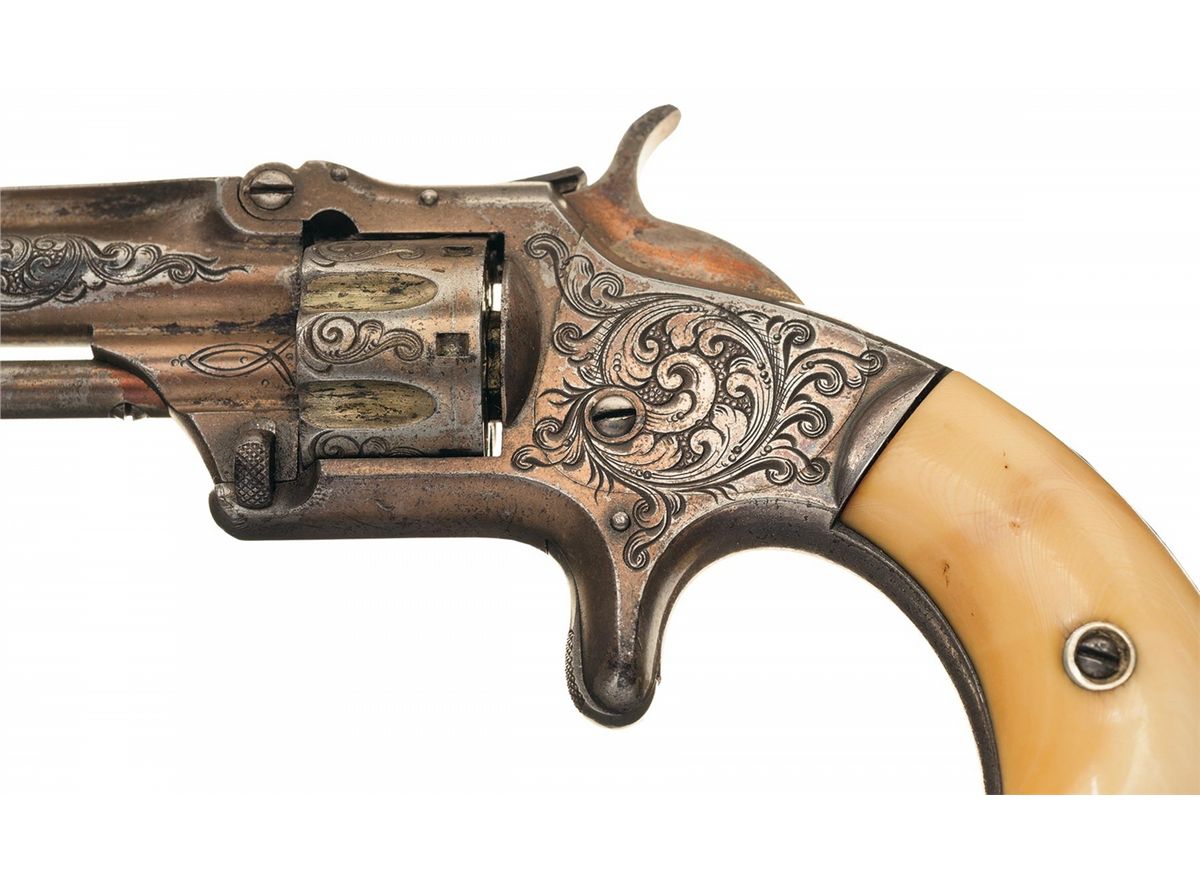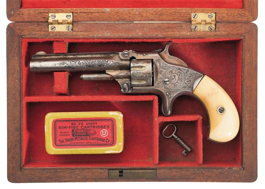 Manufactured circa 1868-1881. The sides of the barrel, cylinder flats and frame are engraved with New York style floral scroll and punch dot designs. The top of the back strap has a starburst and geometric design. The top of the barrel rib is marked with the one line address and patent dates. The serial number is marked on the butt and the matching assembly number is on the front face of the cylinder and rear of the barrel lug. Gold finished and fitted with smooth ivory grips. Comes in a period wooden case with red felt lining. In the case is an unopened 50 count box of UMC 22 short rimfire cartridges.