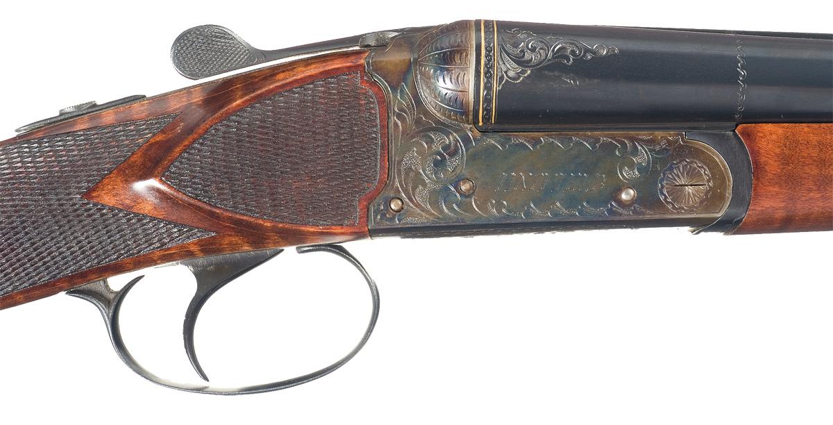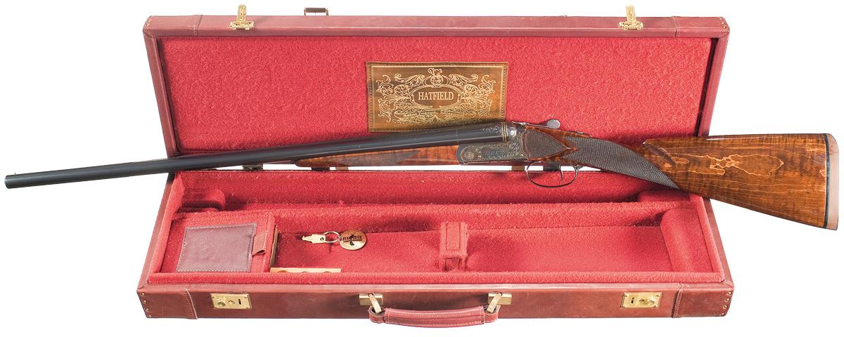 Manufactured in St. Joseph, Missouri, this shotgun features a box lock action, solid matte rib with single brass bead sight, 3" chambers, improved cylinder and cylinder chokes with ejectors. The breech end of the barrels feature engraved wedges of scrollwork and two gold bands. Casehardened and scroll engraved receiver marked "HATFIELD" on both sides. Single non-selective trigger with tang safety. Fancy tiger stripe walnut straight grip stock, with checkered forearm, wrist, and stock side flats. Stock has a solid recoil pad. Length of pull is 14 inches. Complete with a factory oxblood leather luggage case with billiard felt interior.