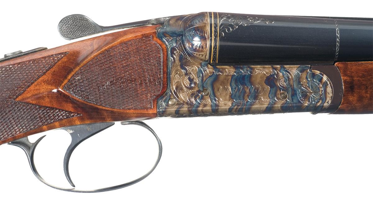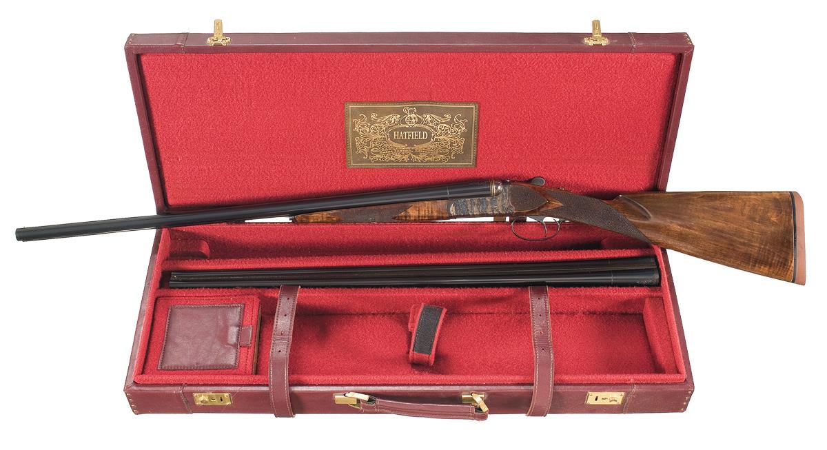 Manufactured in St. Joseph, Missouri, this shotgun features two sets of barrels, a 28 gauge and 20 gauge. Each barrel shares a single forearm and feature 3" chambers, ejectors, single bead sight on a solid matte rib, and a wedge of floral scroll engraving on the sides, with the 20 gauge having two gold bands. 20 gauge gauges at improved cylinder/improved cylinder, 28 gauge gauges at extra full/improved modified. Casehardened box lock action with blue barrels and trigger guard. The action and trigger guard are floral scroll engraved on a punch dot background and each side of the action is engraved "HATFIELD". Single selective trigger with tang mounted safety. Checkered fancy figured walnut forearm and straight grip stock with a solid recoil pad. Length of pull is 14 inches. Complete with factory leather case with felt interior and leather Hatfield interior label.