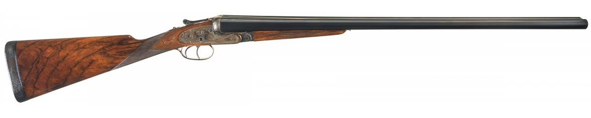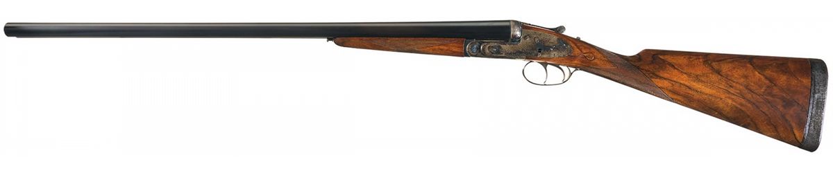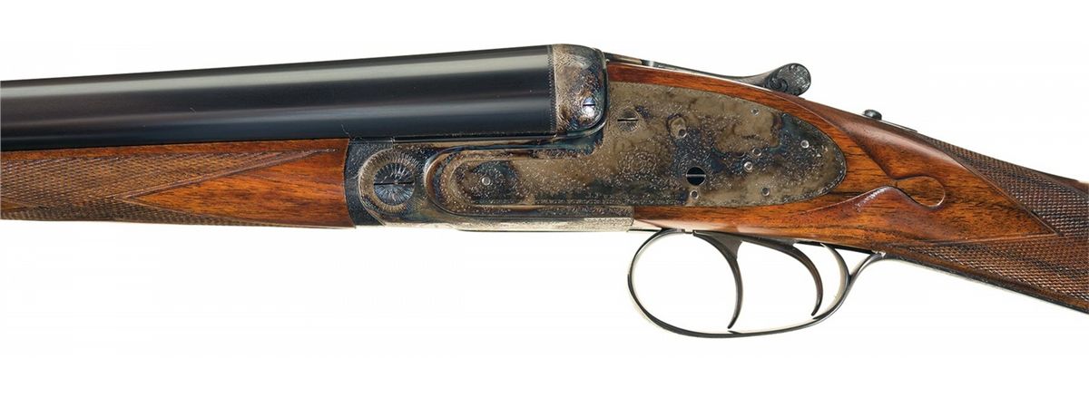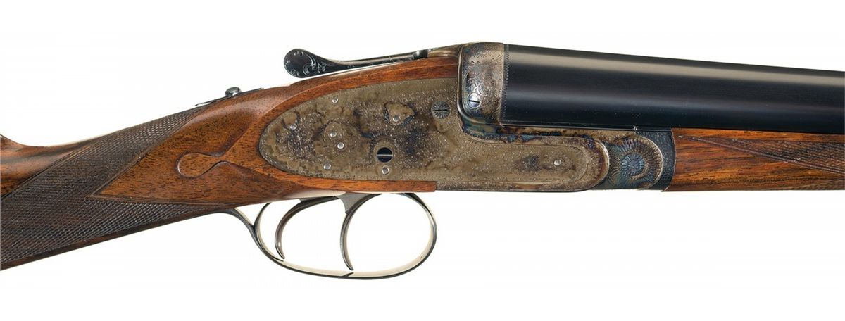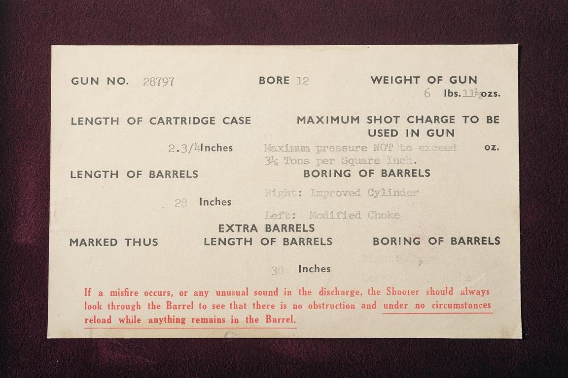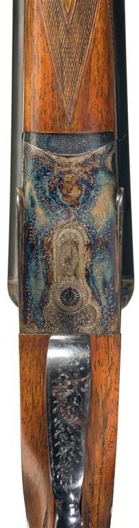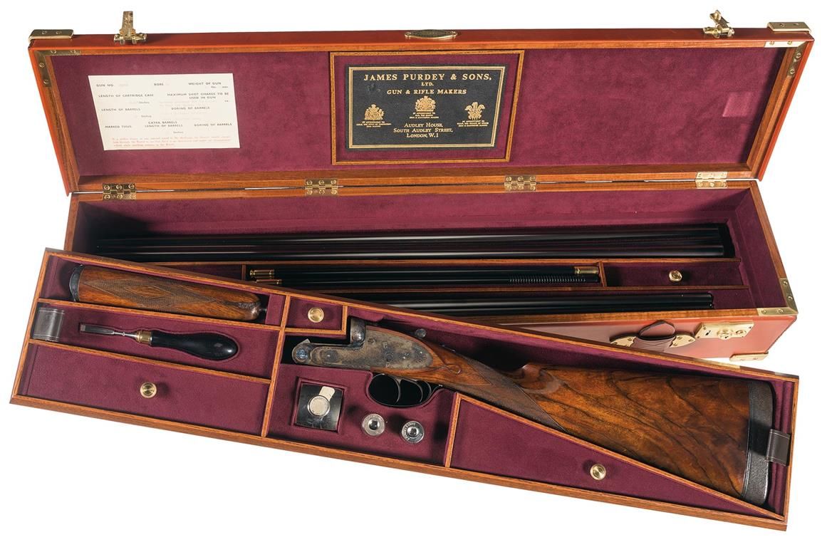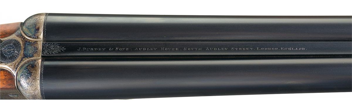 Manufactured in 1985. This two barrel set consists of two 12 gauge barrel sets, one 28 inches in length and the other 30 inches in length. Both have a single brass bead on the solid concave rib both marked "J. PURDEY & SONS. AUDLEY HOUSE. SOUTH AUDLEY STREET. LONDON, ENGLAND". Both have 2 3/4 inch chambers. The 28 inch set is choked improved cylinder/modified, and the 30 inch modified/modified. Both are equipped with ejectors. Both sets share a nicely figured multi-point checkered walnut forearm with floral design engraved hardware. Both sets have various proof marks, ".728" and tonnage markings on the flats and both are numbered to the gun. The frame and side plates are casehardened and nicely decorated with fine scroll and rosette engraving. Each side plate is marked "J. PURDEY & SONS.". Double triggers, niter blue cocking indicators, automatic tang mounted safety with gold "SAFE" and mounted with a nicely figured multi-point checkered walnut straight grip stock with teardrop flats, solid leather recoil pad and gold inset "MJR" on the underside. Drop at the comb is 1 1/2 inches, heel 1 15/16 inches and the length of pull is 15 1/4 inches. Comes in a oak and leather two level Huey case with brass corner protectors and fittings, leather straps and carrying handle. There is a James Purdey & Sons label and measurement tag are affixed to the inside of the lid and wine colored suede lining. In the case are Purdey marked two piece brass and ebony cleaning rod, ebony handled screwdriver, nickel oiler and two snap caps.