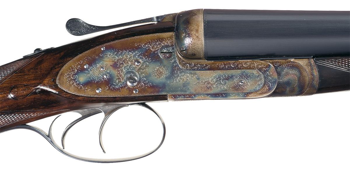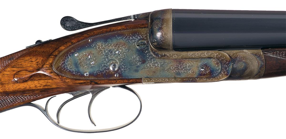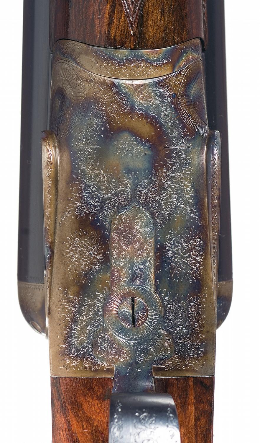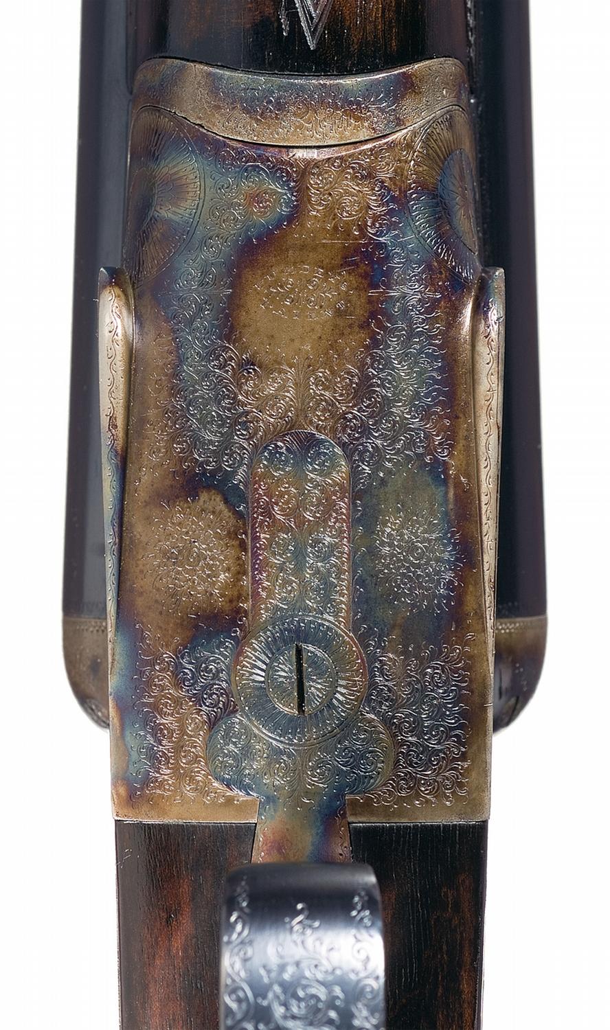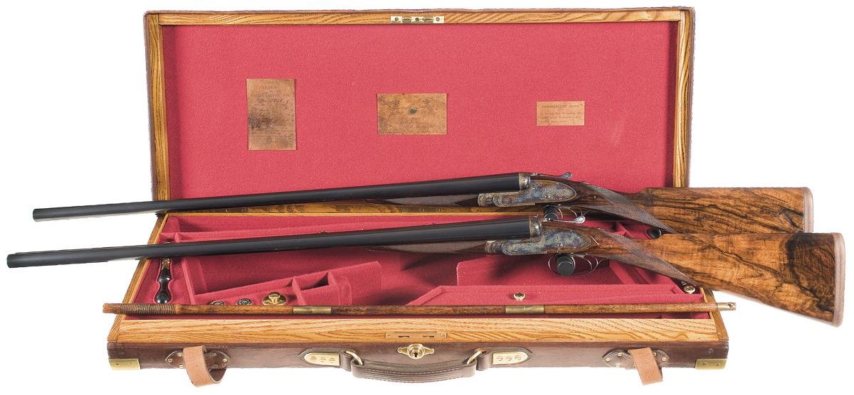 A) Experts agree that J. Purdey & Sons Ltd is probably the finest manufacturer of double barrel shotguns in the world. Virtually all of their shotguns and bolt action rifles are made on a special order basis only. This particular matched pair of side by side shotguns was completed in 1888 for A.R. Blackwood according to information provided by the consignor. Both shotguns have 30" barrels, 2 1/2" chambers, choked modified/modified on this gun and improved modified/improved modified on gun "B", with extractors. The barrels, trigger guard and break lever are blue with casehardened frame, locks and forearm hardware. The frame, side locks, trigger guard, break lever and forearm hardware are engraved with fine English scrollwork. Each lock is marked "J. PURDEY & SONS" and the bottom of the frame is marked "PURDEY'S / PATENT". The breech end of "A" is marked "1" and "B" "2". The top of the ribs are marked "J. PURDEY & SONS AUDLEY HOUSE, SOUTH AUDLEY STREET LONDON MADE OF SIR JOSEPH PRESSED STEEL". Each barrel set is numbered to it's respective gun and the flats are marked with various English proof marks. Polished double triggers, cocking indicators, tang mounted safety with gold inlaid "SAFE" and mounted with checkered extra fancy English walnut splinter forearm and straight grip stock with tear drop flats, solid leather recoil pad and silver initial oval. The set is complete in a oak and leather case with brass corner protector, leather straps and handle and circular brass plaque mounted on the outside of the lid. The case is lined with wine colored velvet. There are three leather labels affixed to the inside of the lid, one is stats on this shotgun, Purdey & Sons label and opening instructions. In the case are a brass tool with female threads and wooden handle, a brass and metal screwdriver with wooden handle, a brass oiler, four snap caps, cleaning tools, and a three piece wood and brass cleaning rod. Length of pull is 14 5/8" on "A" and 14 3/4" on "B".