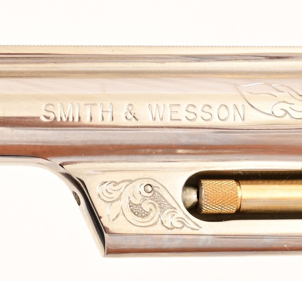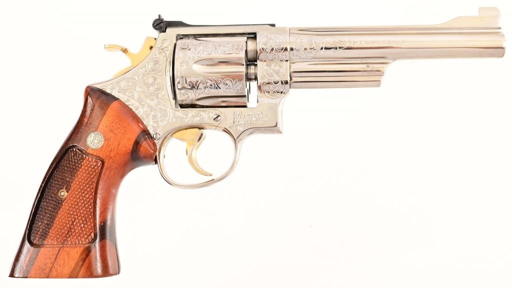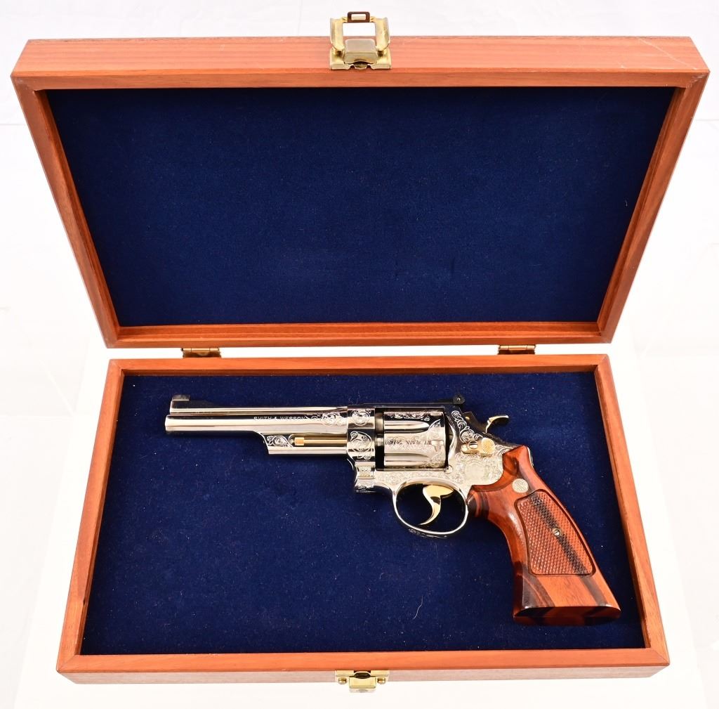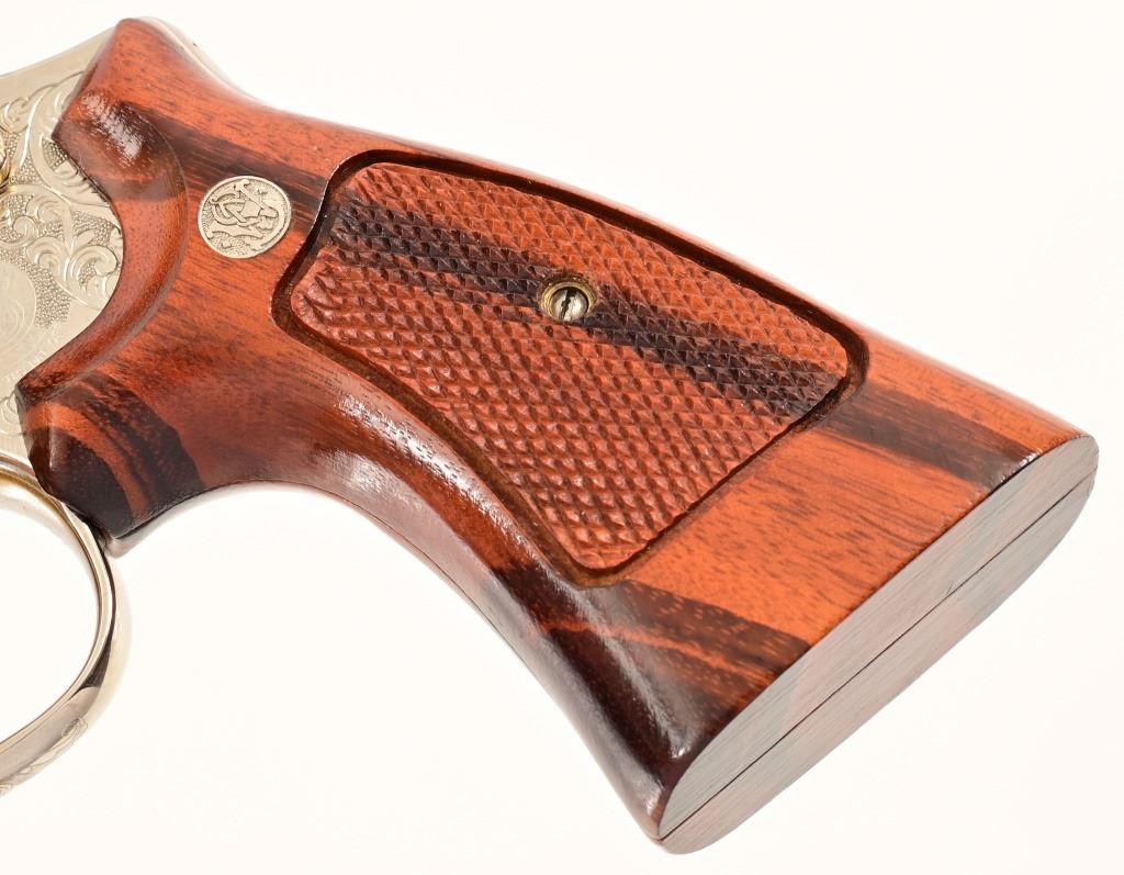 Class A factory engraving with nickel finish. Gold target hammer, target trigger, and cylinder release. Serial AVC9457 (1986) Beautiful gun in great condition, with wood presentation box.