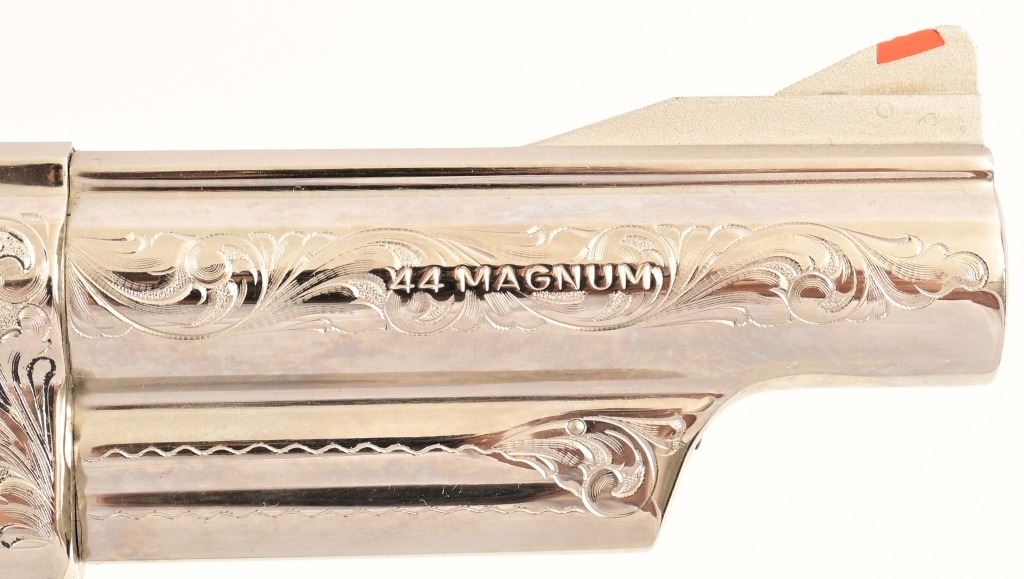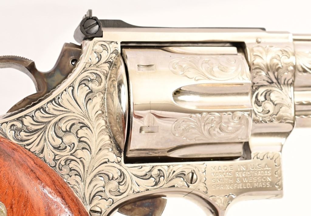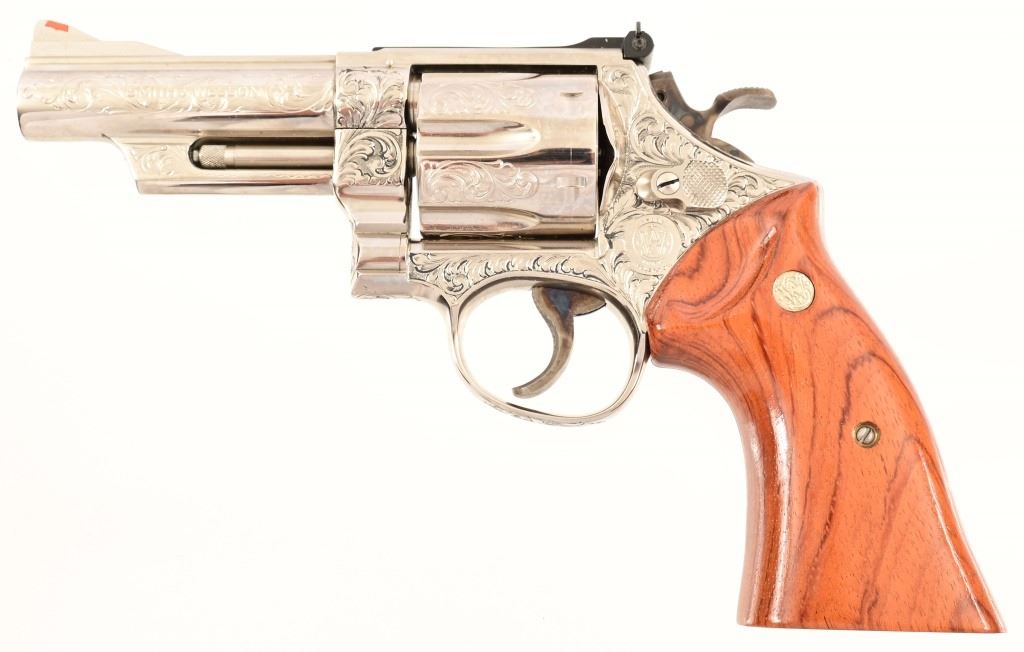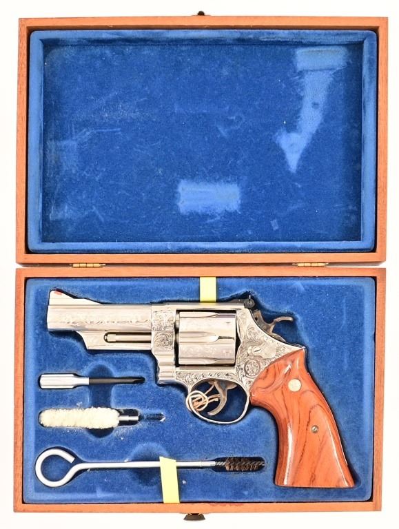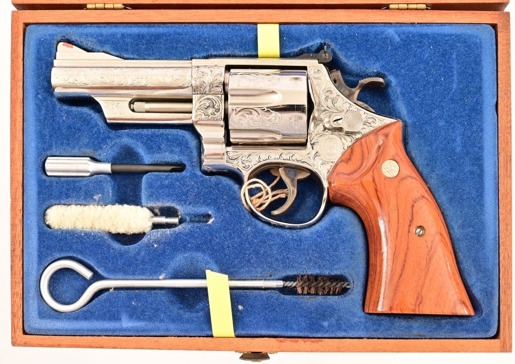 Factory class engraved with nickel plate finish. Fine Goncalo Alves (tigerwood) grips. Target hammer, trigger, and sights. 4" pinned barrel. Serial N465549 (1977-78) Excellent condition, with wood presentation box, paperwork and tools.
