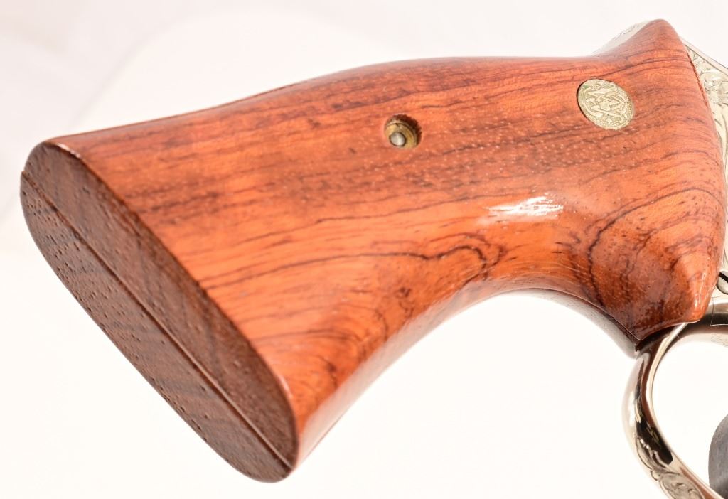 Factory class A engraved 3-screw frame, with nickel plate finish. 6.5" pinned barrel, fine wood grips. Target hammer, trigger, and sights. Serial N472874 (1977-78), wood presentation box, paperwork and tools.