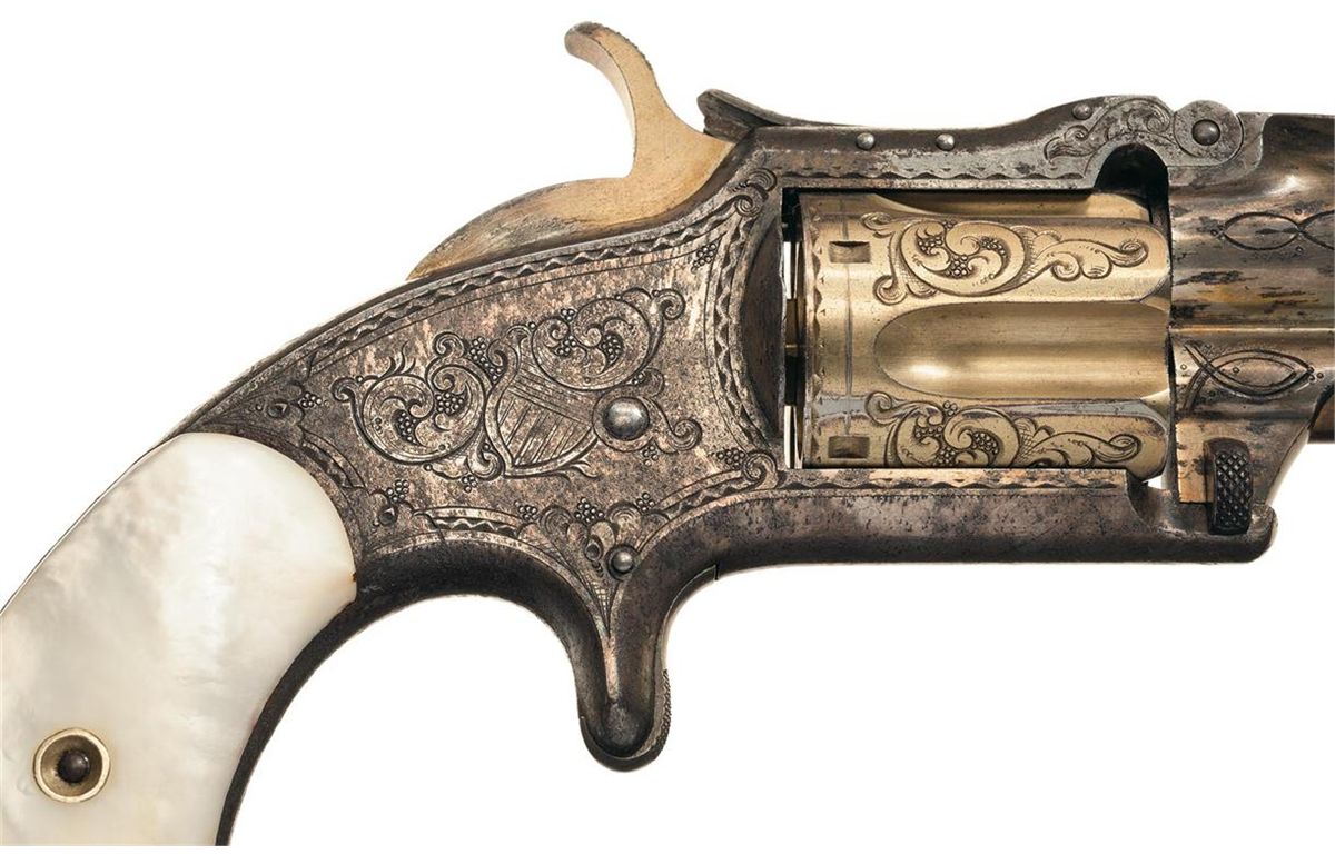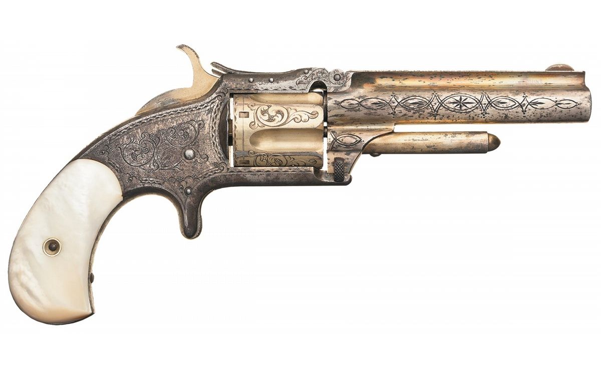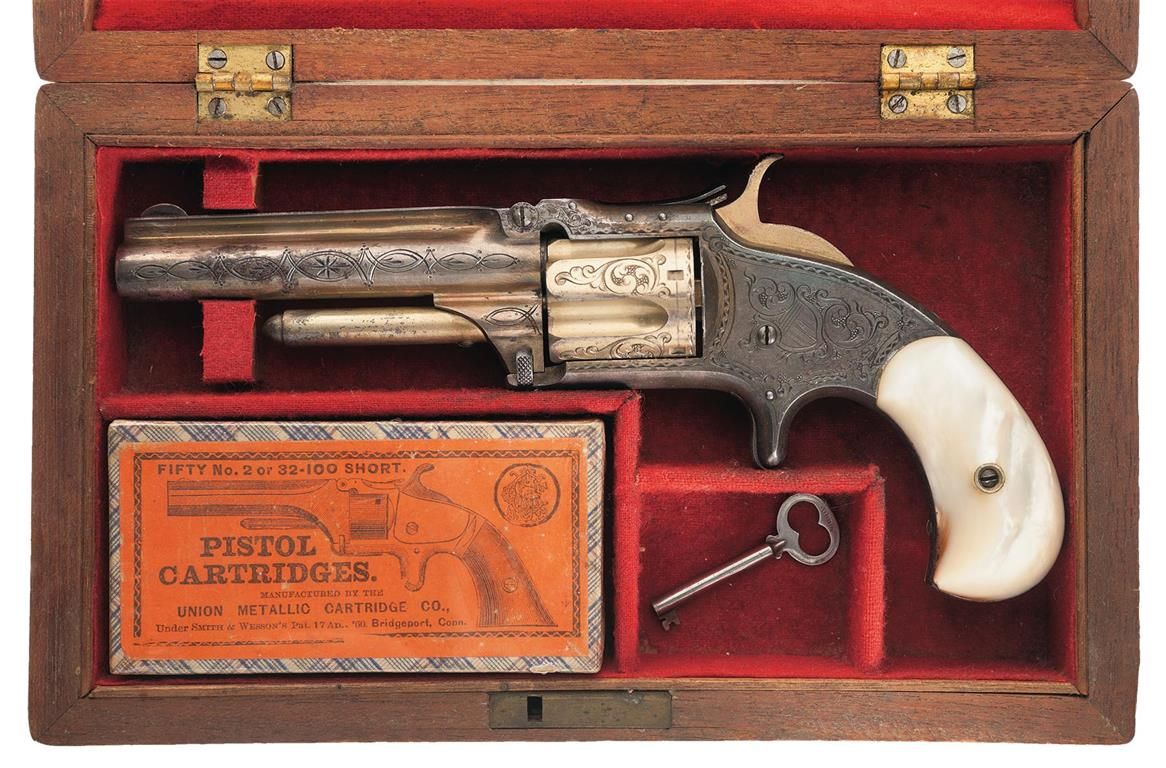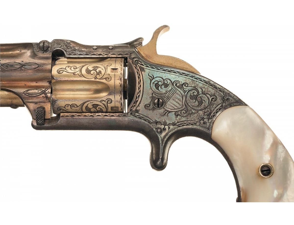 Commonly referred to as the New Model or 2nd Issue 1 1/2 and manufactured between 1868 to 1875. The sides of the barrel have a decorative simple line and starburst design, the cylinder flutes are decorated with floral scroll and punch dot engraving and the frame sides have a shield, and floral scroll and punch dot engraving with a scallop border. The top of the back strap has a decorative geometric design. The serial number is marked on the butt and the matching assembly number "KK7" is marked on the rear cylinder face and back of the barrel lug. The top of the barrel rib is marked with the one line address and patent dates. Blade front sight with notch rear sight and fitted with smooth pearl grips. Comes in a wooden case with red felt lining. In the box is a partially full box of 50 count UMC No. 2 or 32-100 short cartridges and a key. The cartridge box is sealed in cellophane.