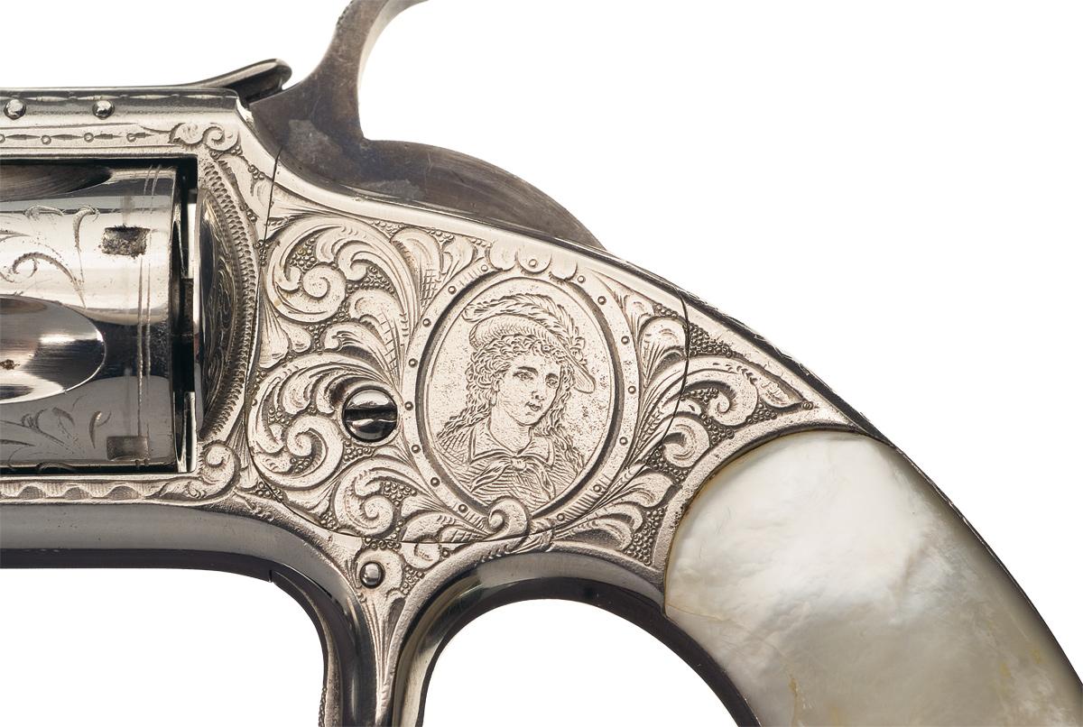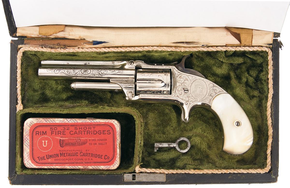 Commonly referred to as the New Model or 2nd Issue 1 1/2 and manufactured between 1868 to 1875. This revolver features a half-moon front sight with notch rear sight. Standard one line address and patent dates on the top of the solid rib barrel. Tip up frame with spur trigger and five shot fluted cylinder. The sides of the frame feature a broad scroll engraving on the punch dot background with a geometric pattern on the backstrap, a floral blossom behind the hammer, and a panel scene portrait of a woman on the left side of frame. The scroll engraving extends to both sides of the barrel with the top strap and barrel rib having an engraved border. The cylinder has a broad scroll engraving on the chambers. Nickel plated with casehardened hammer and fitted with pearl grips. Complete with a green velveteen and silk lined leatherette bound wooden case and an empty box of UMC .32 RF cartridges.