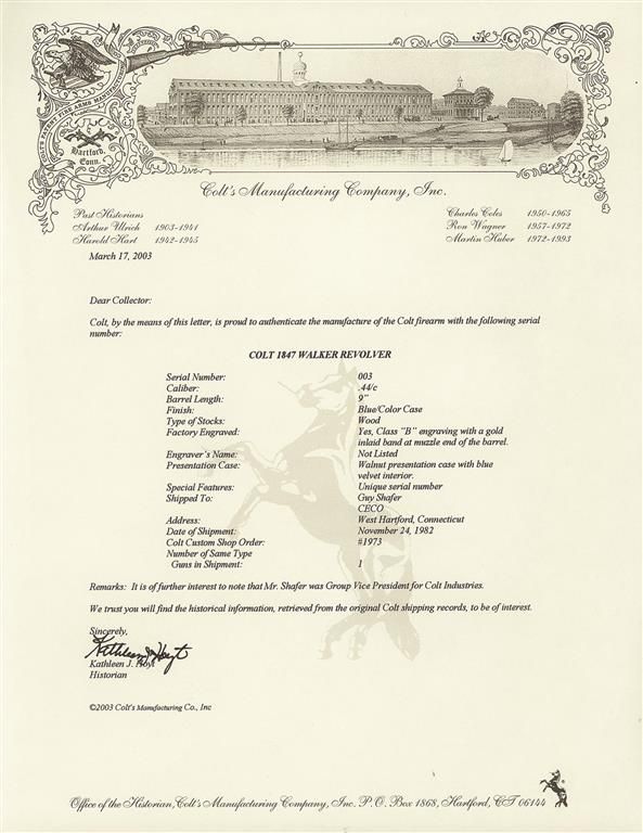 Cased Factory Class "B" Engraved Second Generation Serial Number 3 Colt Walker Percussion Revolver with Factory Letter Ordered By Guy C. Shafer Colt Industries Group Vice President