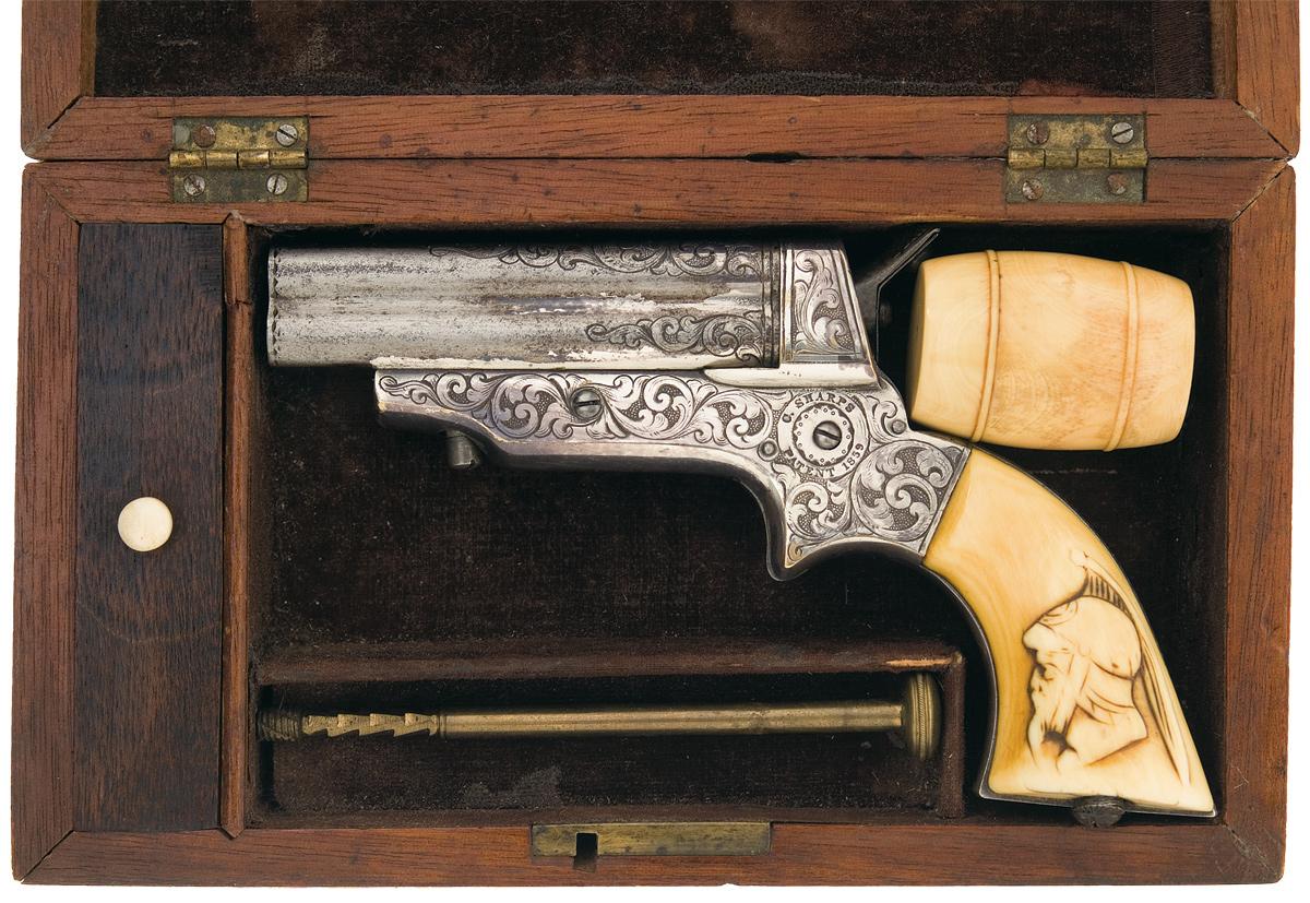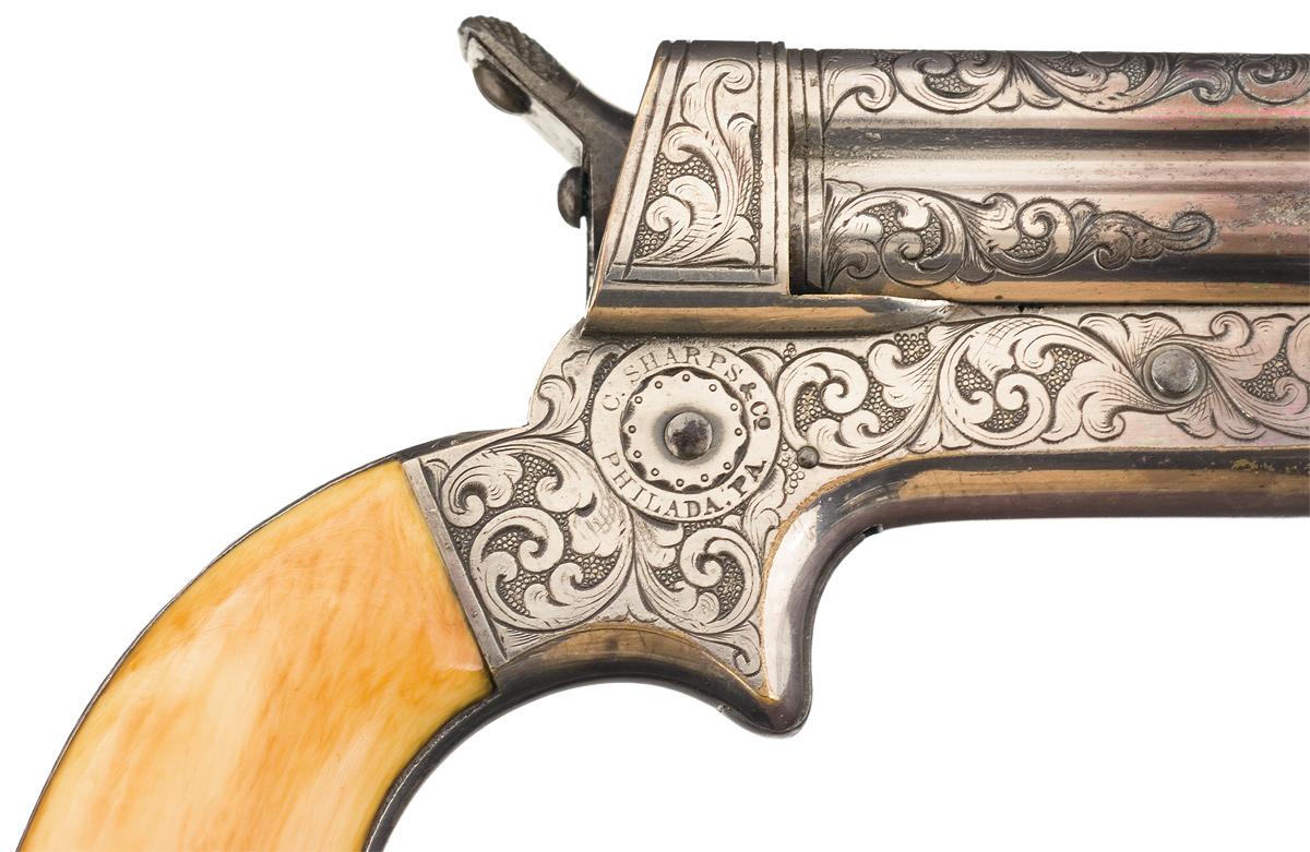 Manufactured between 1859 and 1874. The sides of the frame feature nice floral scroll engraving, with a punch dot background and a simple double line border on the breechblock. The breech ends of the barrels have the same pattern, extending a bit further forward on the top barrels. The butt has a simple line and shell design. The backstrap has a scallop border with a simple line design in the center. The left side of the frame is marked "C. SHARPS / PATENT 1859" and the right side "C SHARPS & Co. / PHILADA, PA". The matching serial number is marked on the bottom of the barrels and on the butt. All parts have been silver plated and the pistol is fitted with the bust of a medieval warrior relief carved on the left side and smooth on the right side. Complete in a wooden case with brown velvet lining, a covered compartment with ivory pull, brass cleaning rod and barrel shaped ivory container.