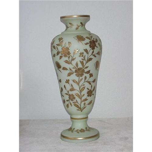 A very pretty and decorative cased glass vase, 19 1/2" tall, 8" in diameter. Light green cased over whit glass decorated with gold flowers and butterflies. The vase was made with a hole in the bottom, shown, and can be converted into a lamp or used as a decorative vase. The condition is beautiful, there are no chips or cracks the gold decoration is in very good condition. The paper label reads made in Germany, US Zone.