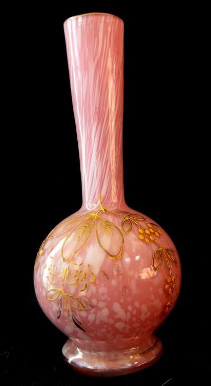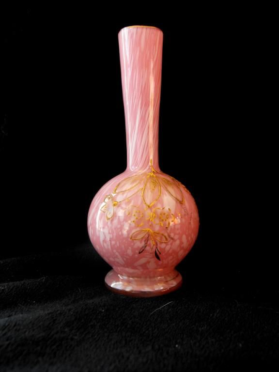 Blown of pink and white opaque spatter glass. Vase has hand painted daisy button floral enamel and gold overlay decoration with some fading found on the gold. Rim is cut and the low footed base has no pontil.Not marked and attributed to Bohemian glass maker, Franz Welz or Harrach. There is no chips ot hairline breaks on the vase. Measures 6-3/8" tall with a 1" diameter rim and the base is 1-3/4" diameters.