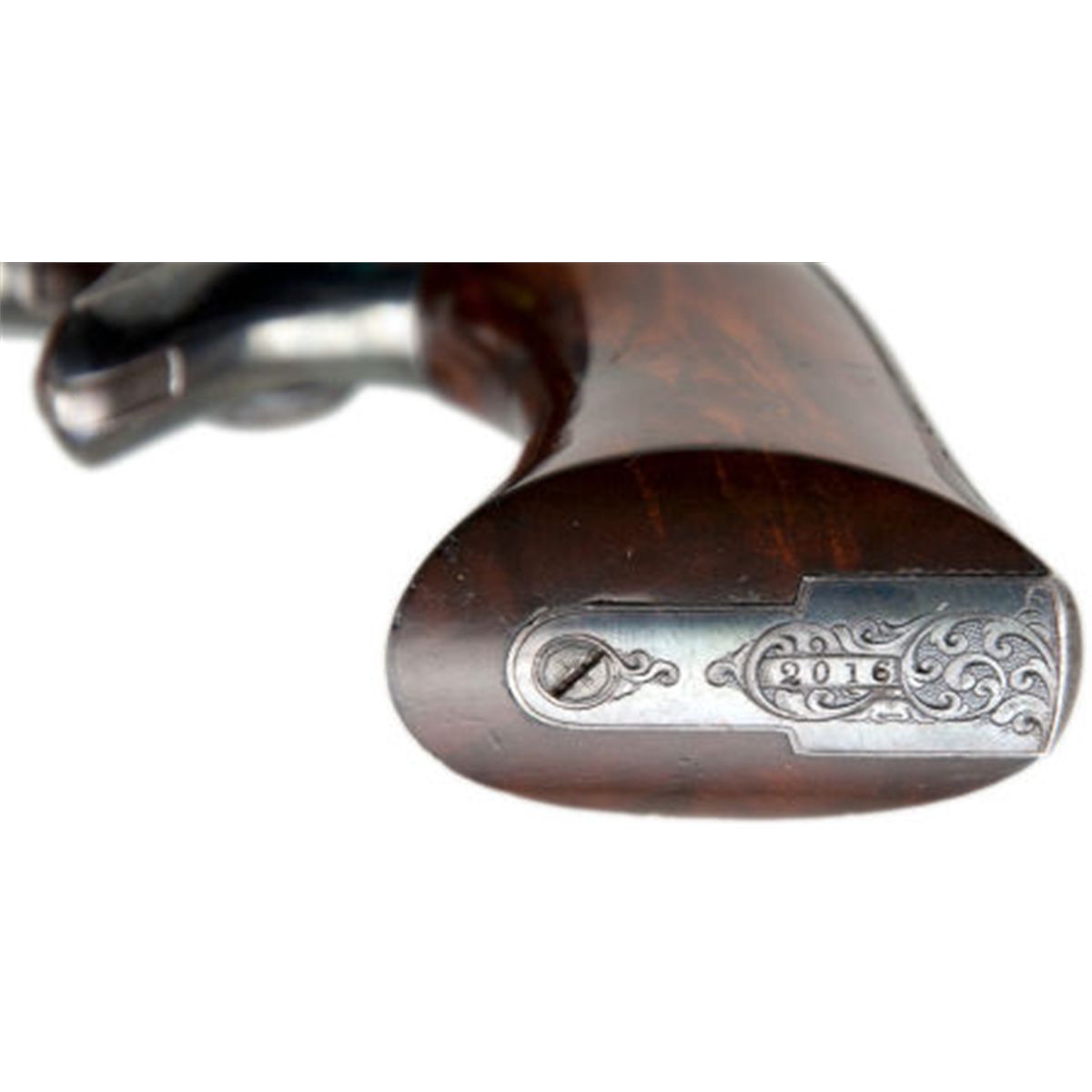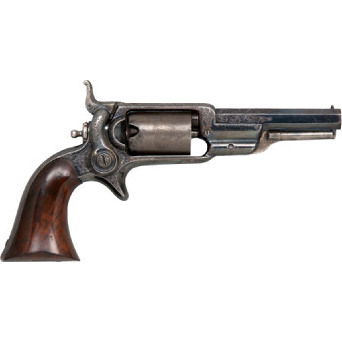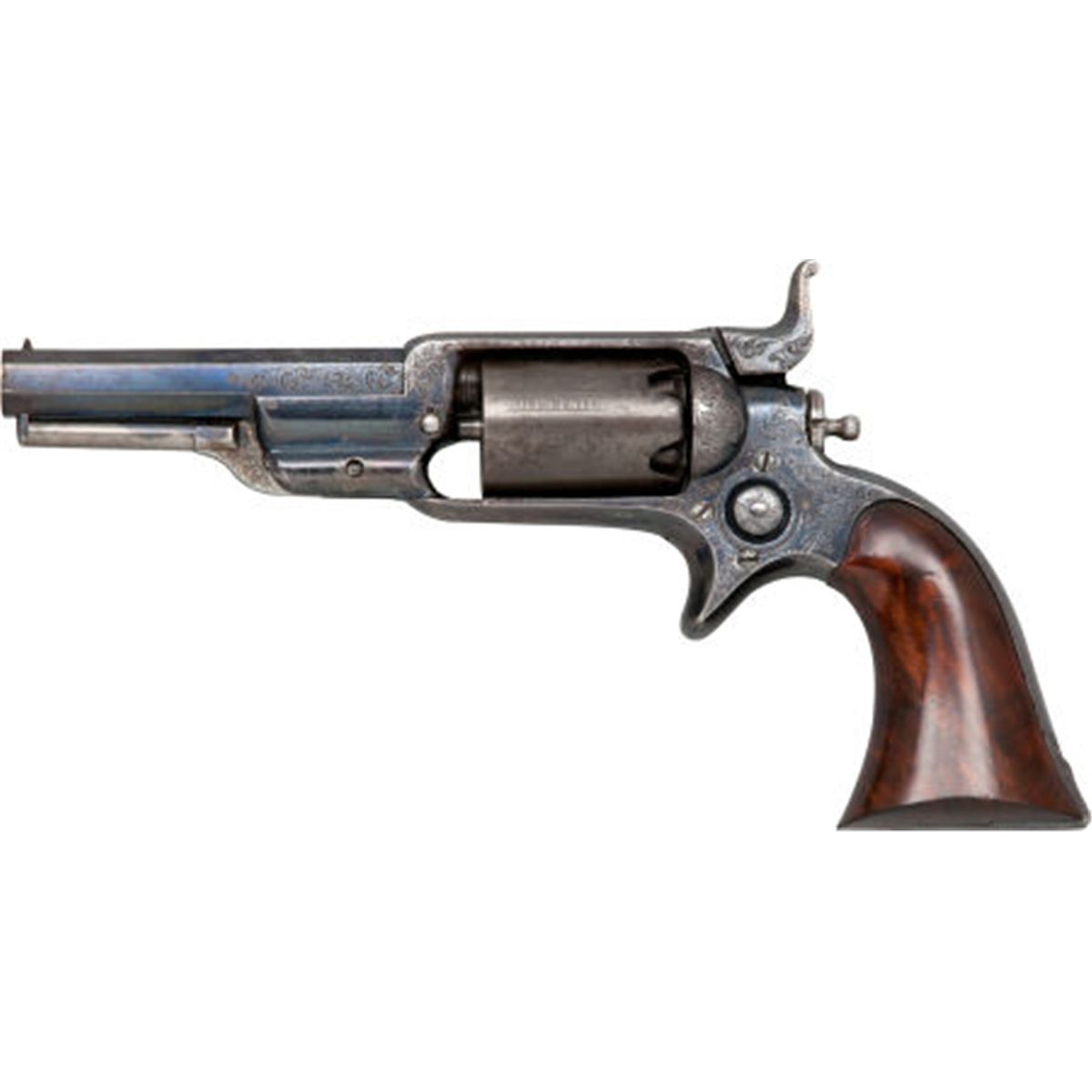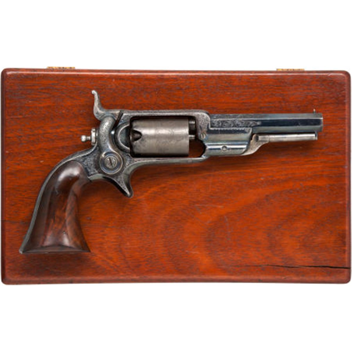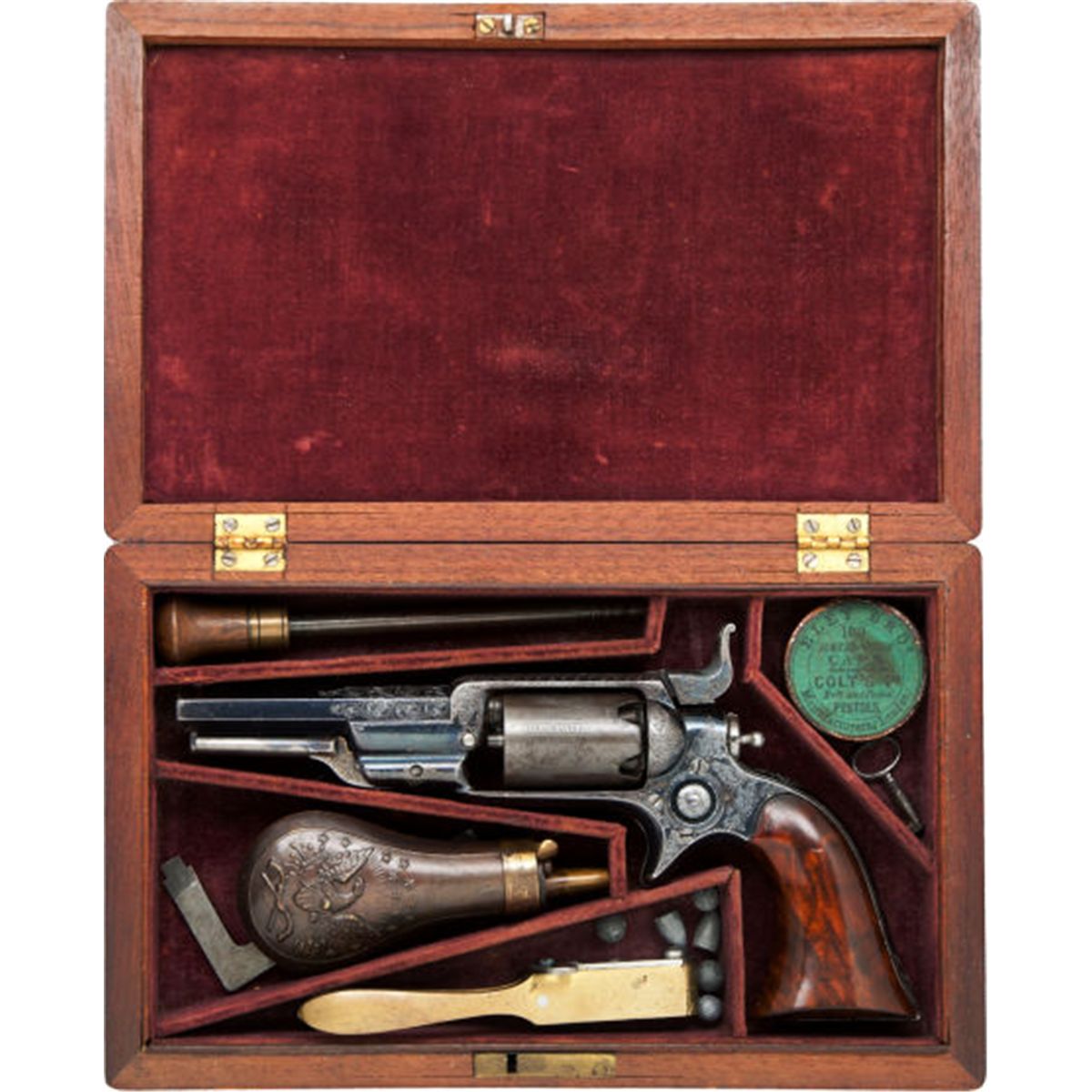 Cased, Gustav Young Engraved Colt Second Model 1855 Root Side-Hammer Pocket Revolver. This excellent Colt is pictured in "The Book of Colt Engraving". Serial no. 2016, .28 caliber, 3 ½-inch octagonal barrel with Hartford address and pointing hand motif. Blued finish. Cabin and Indian cylinder scene. Finely Gustav Young factory scroll-engraved throughout. Case-hardened lever, side-hammer and trigger. Spur trigger. Varnished burlwood one-piece wraparound grip. Contained in original keyed factory walnut, burgundy velvet lined, partitioned case together with Colt powder flask, brass Colt's Patent two-cavity bullet mold, Eley blue label cap tin, cleaning rod, "L" tool and bullet supply. Ex. - Greg Lampe Collection.Condition: Excellent. Retaining approximately 95% finish to barrel and frame. Cylinder, with excellent scene showing a dark, gray/brown patina. Grips excellent. Action crisp. Case and accoutrements with light wear and patina. Minor hairline crack in lid.