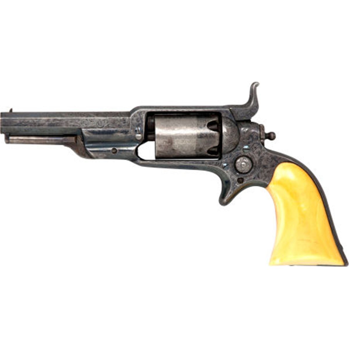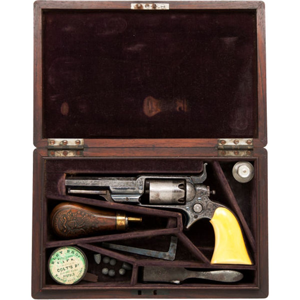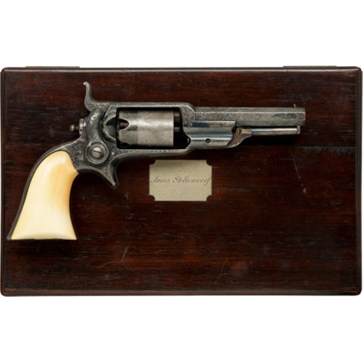 Cased Gustav Young Factory Engraved Colt Second Model 1855 Root Side-Hammer Pocket Revolver Belonging to Amos Stellenwerf. Serial no. 26484, .28 caliber, 3 ½-inch octagonal barrel with Hartford address. Fully scroll-engraved. Blued finish. Case-hardened lever, hammer and trigger. 5-shot unfluted cylinder with cabin and Indian scene. Engraved screws. One-piece wraparound ivory grips. Contained in original factory deluxe rosewood, dark violet velvet lined partitioned presentation case together with accompanying accessories including: Colt eagle flask, James Dixon & Son marked pewter oiler, "L" tool, Colt's Patent two-cavity bullet mold, Eley's cap tin and bullet supply. Top of lid with German silver escutcheon engraved: Amos Stellenwerf. Case with German silver reinforcement corner bands. Mr. Stellenwerf was a prominent innkeeper who operated the Lake House in the south shore area of Islip, Long Island. His establishment was opened in 1856 and was easily accessible via the Southside Railroad [later the Long Island Railroad], had bath houses on the lake and was known for its excellent cuisine. Amos Stellenwerf's daughter, Louise, married Thomas Worth, a noted artist with Currier and Ives, who depicted the Lake house in a Currier & Ives print of the period. Later, the Lakehouse was converted to an estate known as Brookwood Hall, then an orphanage and finally as Brookwood Mansion where it currently serves as the home of the Islip Art Museum, Islip Arts Council and other Islip Town offices. Sold together with a provenance file including copies of photos of Stellenwerf; an engraving of the Lake House; a Currier & Ives print of the Lake House; a Civil War period photo of the Lake House; a copy of the dinner menu and a photo image of the site as it appeared in 1999. Condition: Fine to excellent. Retaining approximately 85% finish on frame and barrel; 50% on cylinder with 100% cylinder scene. Grips excellent with mellow age patina. Action crisp. Case with light wear and minor losses to veneer. No key present. Accessories: oiler fine; screwdriver 70% blue; Root flask with minor dents; cap tin with 90% lacquer/60% label; Root bullet mold with 40% blue; assorted bullets fine.