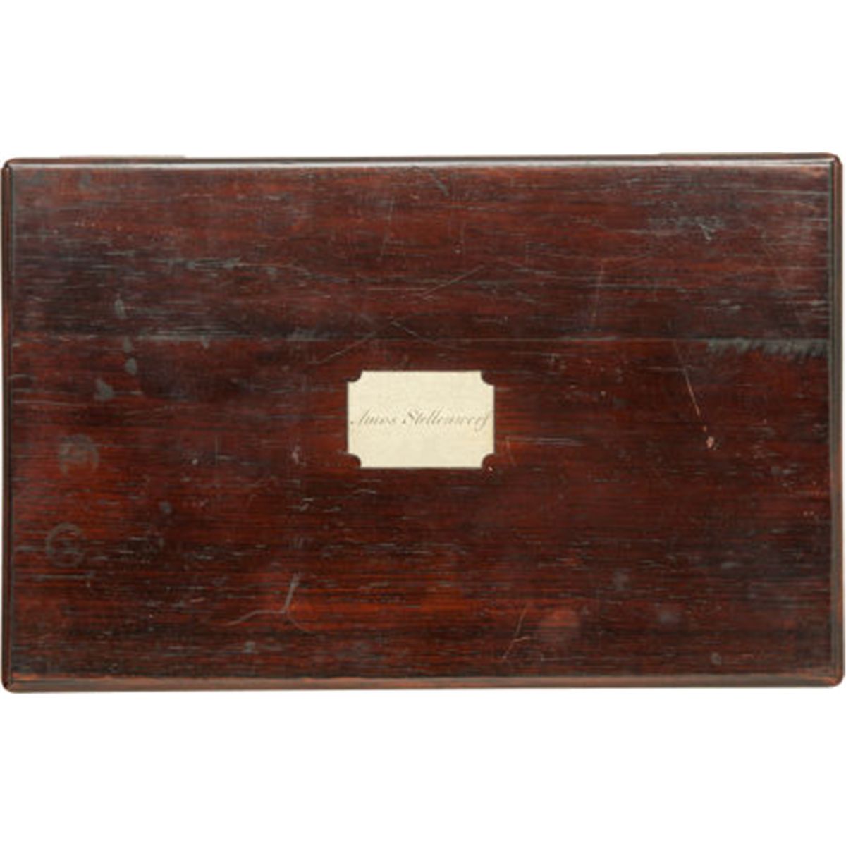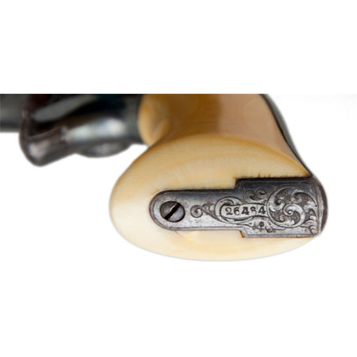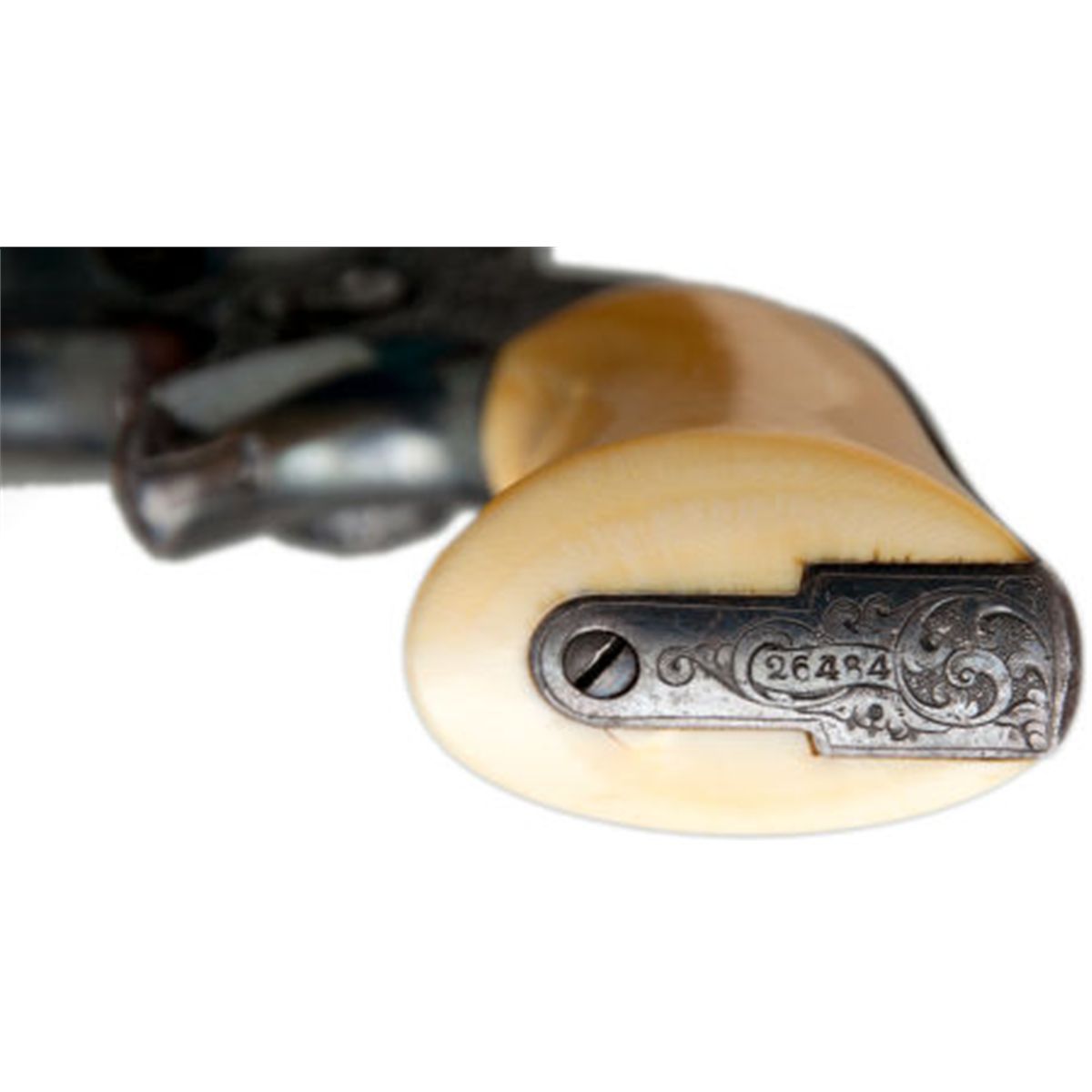Cased Gustav Young Factory Engraved Colt Second Model 1855 Root Side-Hammer Pocket Revolver Belonging to Amos Stellenwerf. Serial no. 26484, .28 caliber, 3 ½-inch octagonal barrel with Hartford address. Fully scroll-engraved. Blued finish. Case-hardened lever, hammer and trigger. 5-shot unfluted cylinder with cabin and Indian scene. Engraved screws. One-piece wraparound ivory grips. Contained in original factory deluxe rosewood, dark violet velvet lined partitioned presentation case together with accompanying accessories including: Colt eagle flask, James Dixon & Son marked pewter oiler, "L" tool, Colt's Patent two-cavity bullet mold, Eley's cap tin and bullet supply. Top of lid with German silver escutcheon engraved: Amos Stellenwerf. Case with German silver reinforcement corner bands. Mr. Stellenwerf was a prominent innkeeper who operated the Lake House in the south shore area of Islip, Long Island. His establishment was opened in 1856 and was easily accessible via the Southside Railroad [later the Long Island Railroad], had bath houses on the lake and was known for its excellent cuisine. Amos Stellenwerf's daughter, Louise, married Thomas Worth, a noted artist with Currier and Ives, who depicted the Lake house in a Currier & Ives print of the period. Later, the Lakehouse was converted to an estate known as Brookwood Hall, then an orphanage and finally as Brookwood Mansion where it currently serves as the home of the Islip Art Museum, Islip Arts Council and other Islip Town offices. Sold together with a provenance file including copies of photos of Stellenwerf; an engraving of the Lake House; a Currier & Ives print of the Lake House; a Civil War period photo of the Lake House; a copy of the dinner menu and a photo image of the site as it appeared in 1999. Condition: Fine to excellent. Retaining approximately 85% finish on frame and barrel; 50% on cylinder with 100% cylinder scene. Grips excellent with mellow age patina. Action crisp. Case with light wear and minor losses to veneer. No key present. Accessories: oiler fine; screwdriver 70% blue; Root flask with minor dents; cap tin with 90% lacquer/60% label; Root bullet mold with 40% blue; assorted bullets fine.