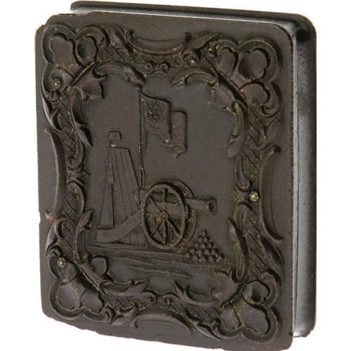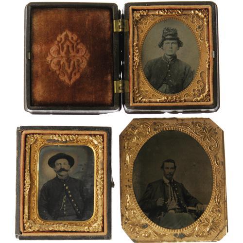 <B> Cased Images Men in Soldier's Coats.</B></I> Here we present three unattributed and unidentified gents in soldier's coats. Two are 1/9th plate size with one in thermoplastic case. The third image in a tin frame is 1/6th plate size. All three are clean bright images.