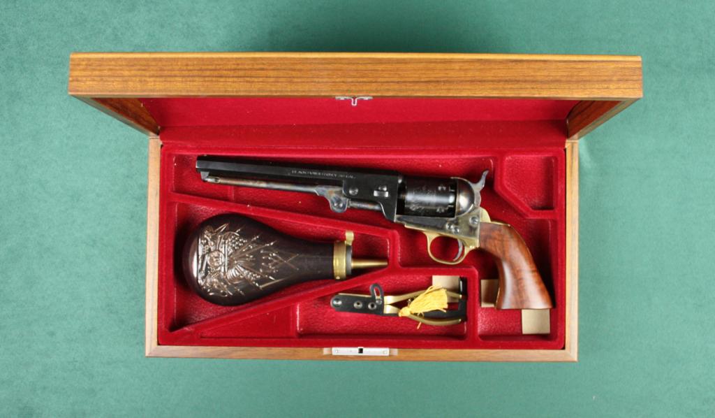 Cased Italian-made copy of a Colt Model 1851  Navy percussion revolver, .36 cal., 7-1/2”  octagon barrel, black and case hardened  finish, wood grips, #311203. This gun is in  overall like new condition showing littlehandling, fine lined wood case with  reproduction brass powder flask, dual cavity  bullet mold and combination wrench.  Est.:   $300-$600.