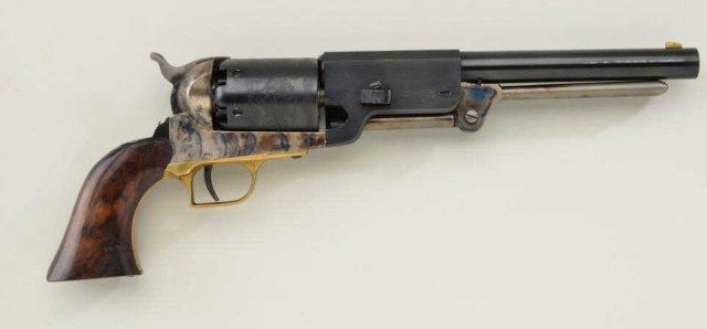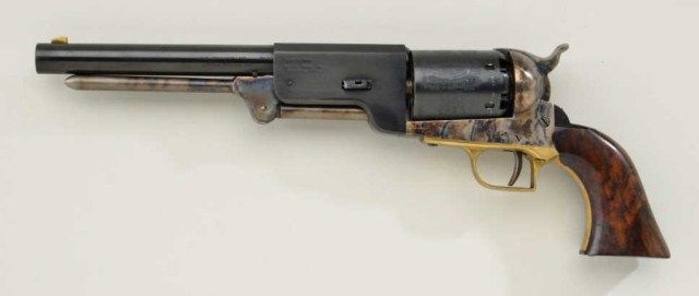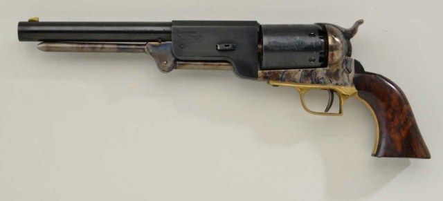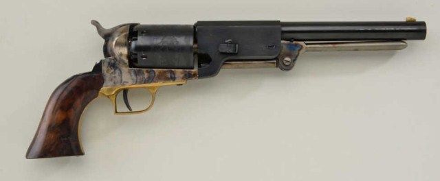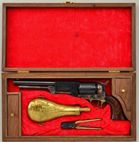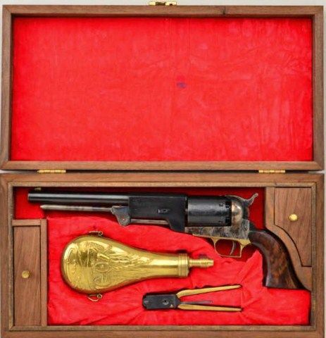 Cased Italian-made copy of a Colt Walker percussion revolver for Replica Arms Co., .44 cal., 9” barrel, blue and case hardened finish, deluxe grained wood grips, #4927. This gun is in overall fine condition showing the majority of its original blue finish to the barrel and cylinder and the majority of its original case colors on the frame, hammer and loading lever; brass trigger guard; crisp action, fine bore and grips. The wooddisplay case is also in overall fine condition with red lining and accompanied by a Walker style reproduction brass powder flask and reproduction bullet mold; also two wood covered compartments, one including akey to the case’s lock. Est.: $200-$400.