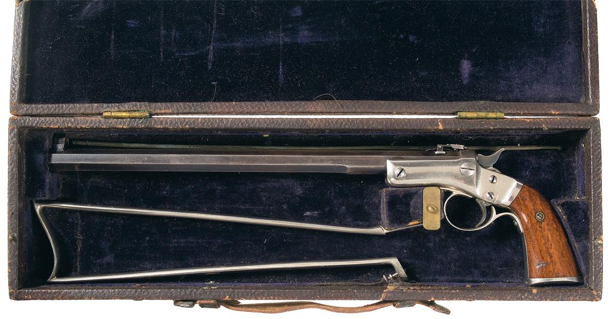 Hooded pin front sight with a German silver blade sight mounted on top of the hood with adjustable elevation/peep rear sight. Checkered hammer and trigger with trigger guard. Left side of barrel at the breech is marked with the two line address/patent date marking. Blue with nickel frame and walnut grips. Complete with a nickel plated stock numbered to the gun. In a leather bound case.