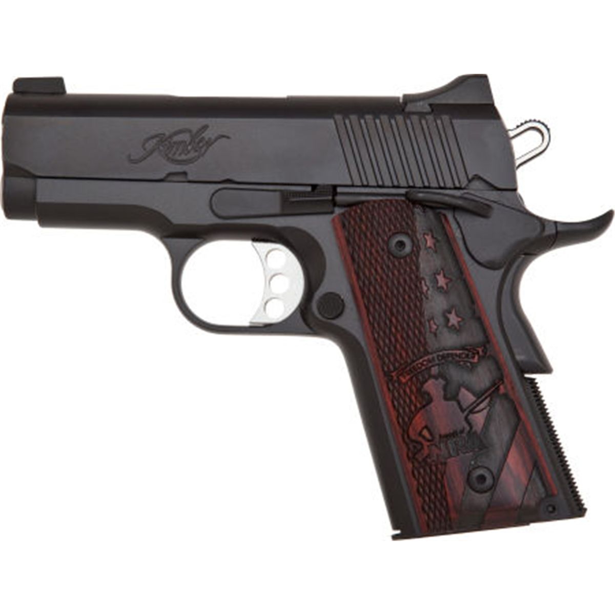 Cased Kimber NRA Commemorative Ultra Carry Semi-Automatic Pistol. Serial no. KNRA091080, .45 ACP caliber, 3-inch barrel. Satin black finish. Skeleton hammer. Anodized trigger with perforated sides. Checkered exotic hardwood grips with relief-carved NRA patriotic motifs. Contained in original factory travel case together with two extra magazines. Condition: Excellent. NRA FIREARMS FOR FREEDOM PROGRAM