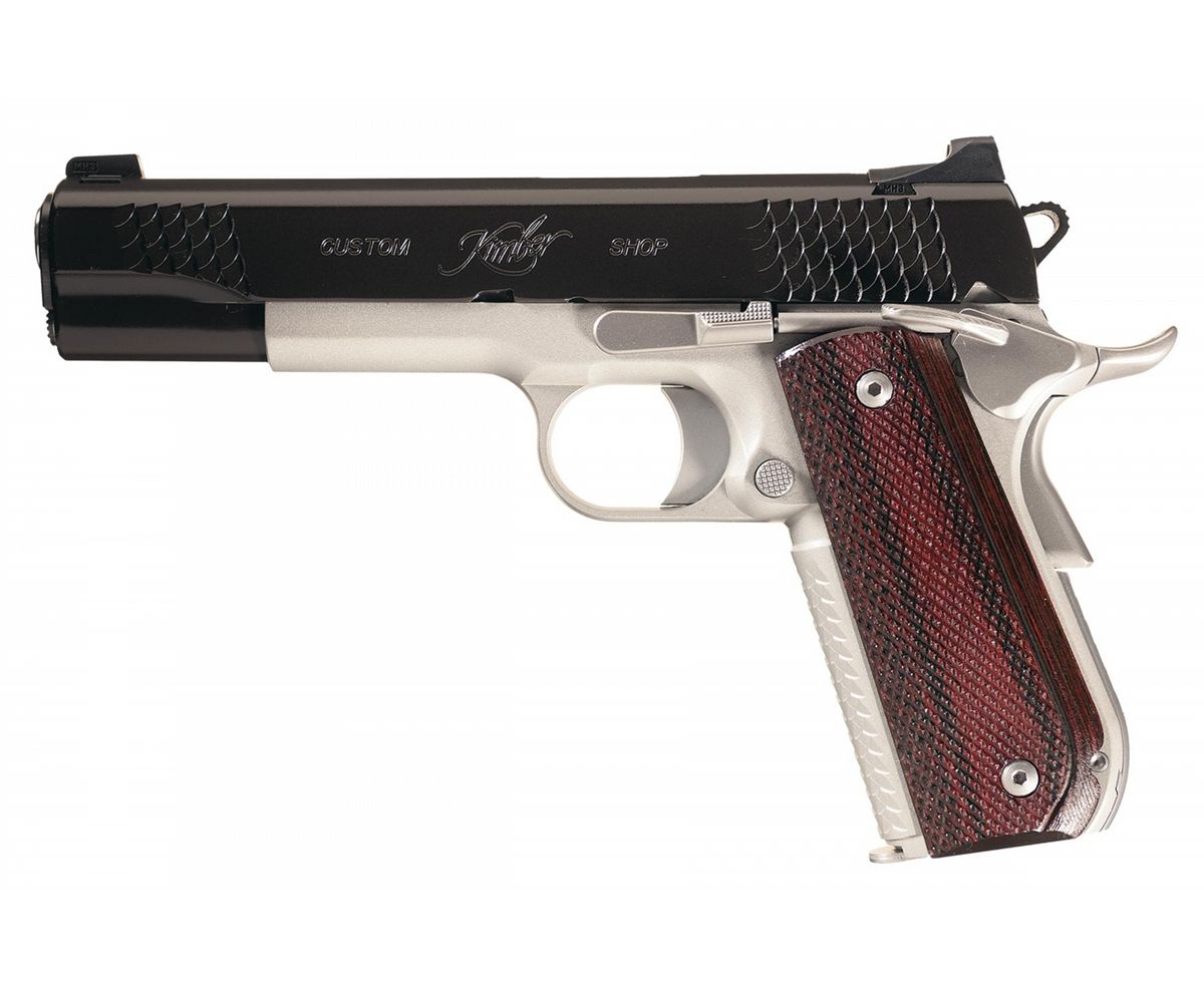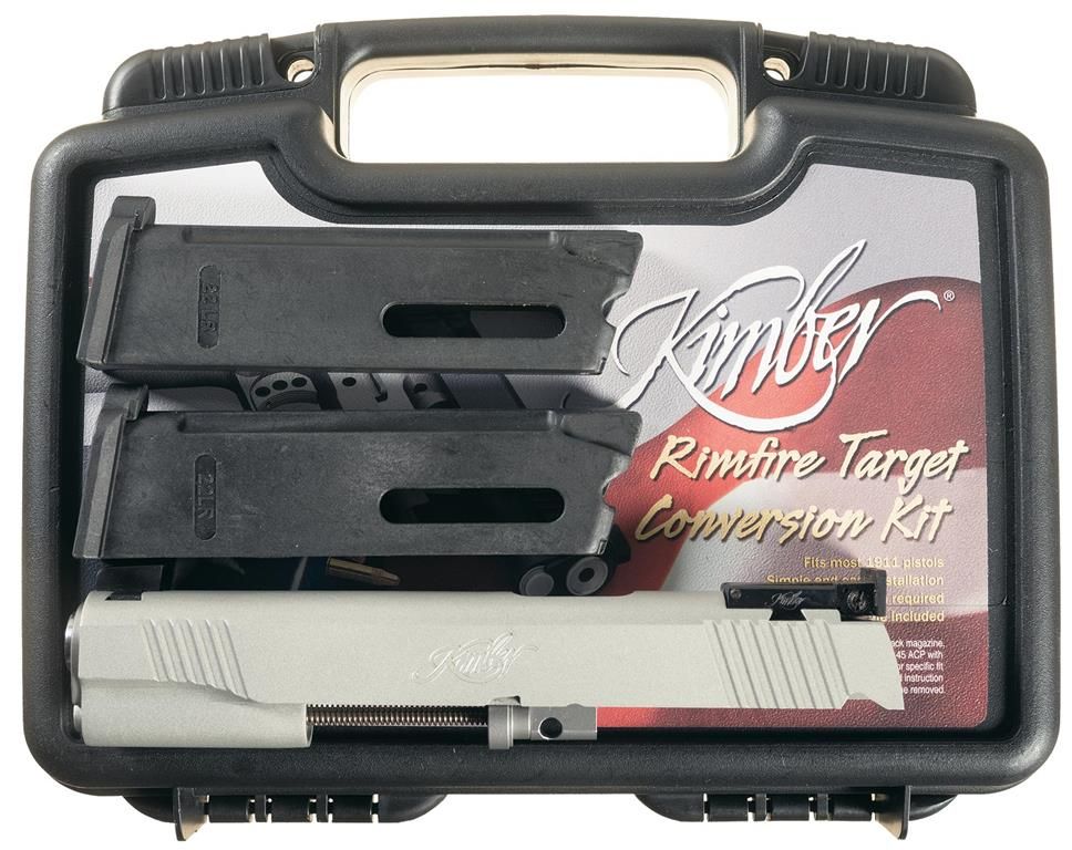 Flat top slide with front, rear and top serrations. Fixed white dot/tritium night sights with a cocking shoulder on the rear sight. Ambidextrous safety and a rounded mainspring housing and frame. Fitted with checkered laminated micarta grips. Complete with factory hardcase numbered to the gun and a cased Kimber 22 LR rimfire conversion kit with satin silver slide and adjustable sights.
