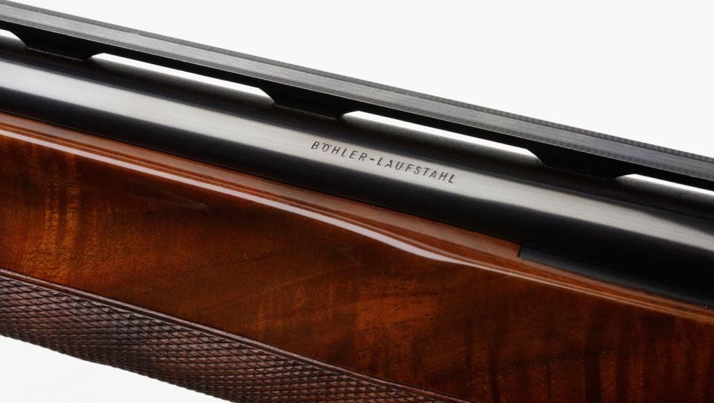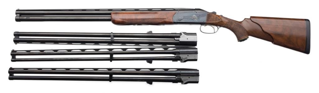 Cased Krieghoff Model 32 over/under semi-automatic shotgun, 4 barrel set: 10 gauge, 28” barrels; 20 gauge, 28” barrels; 28 gauge, 28” barrels and .410 gauge, 28” barrels; S/N 9054, blued finish, checkered wood stock with Hydro-shock butt stock. This set is in overall fine condition with fine bores, crisp actions and beautiful wood. Est.: $5,000-$8,000.