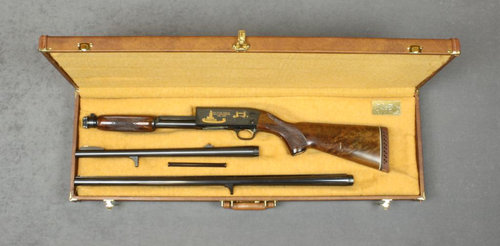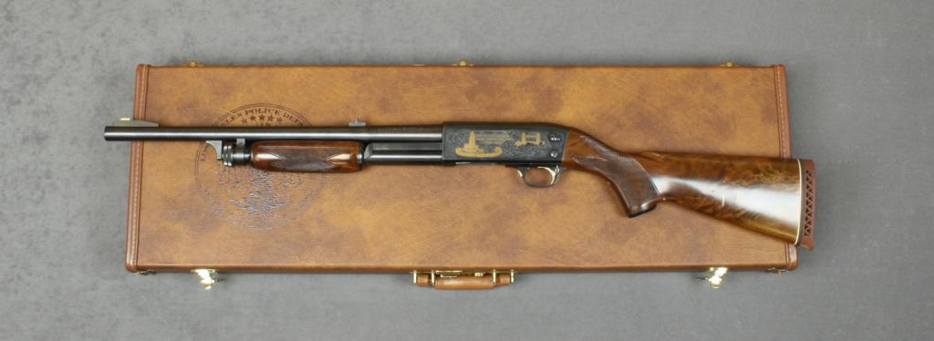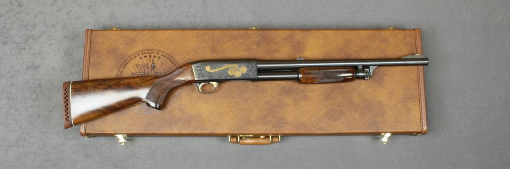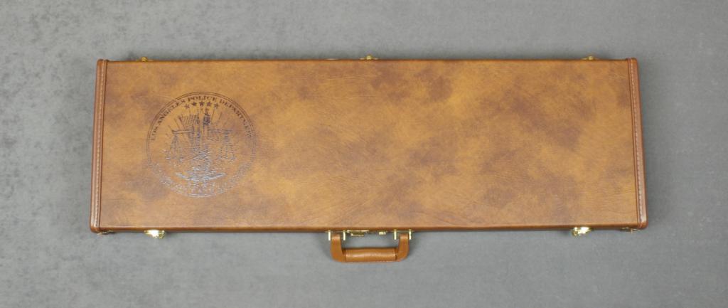 Cased LAPD  City of Los Angeles 200th  Anniversary (1781-1981) Commemorative Ithaca  Model 37 Featherlight pump action shotgun,  two barrel set, 12 gauge, 28” and 18-1/2”  barrels, blue finish with gold accentedpanels on each side of the receiver, deluxe  checkered wood stocks, #LAPD-1318.  This gun  is in overall excellent condition showing  little use; case is also excellent and  contained in cardboard shipping box (Joe,Dave or Roland, if you don’t have yours yet,  here’s the ticket).  Est.:  $750-$1,500.