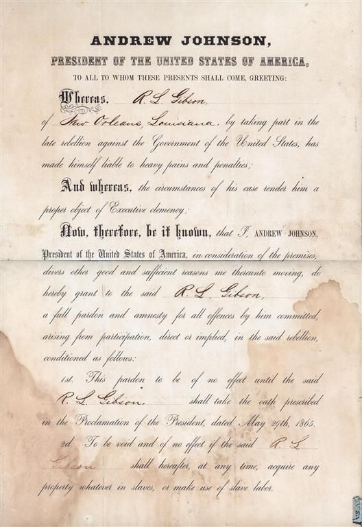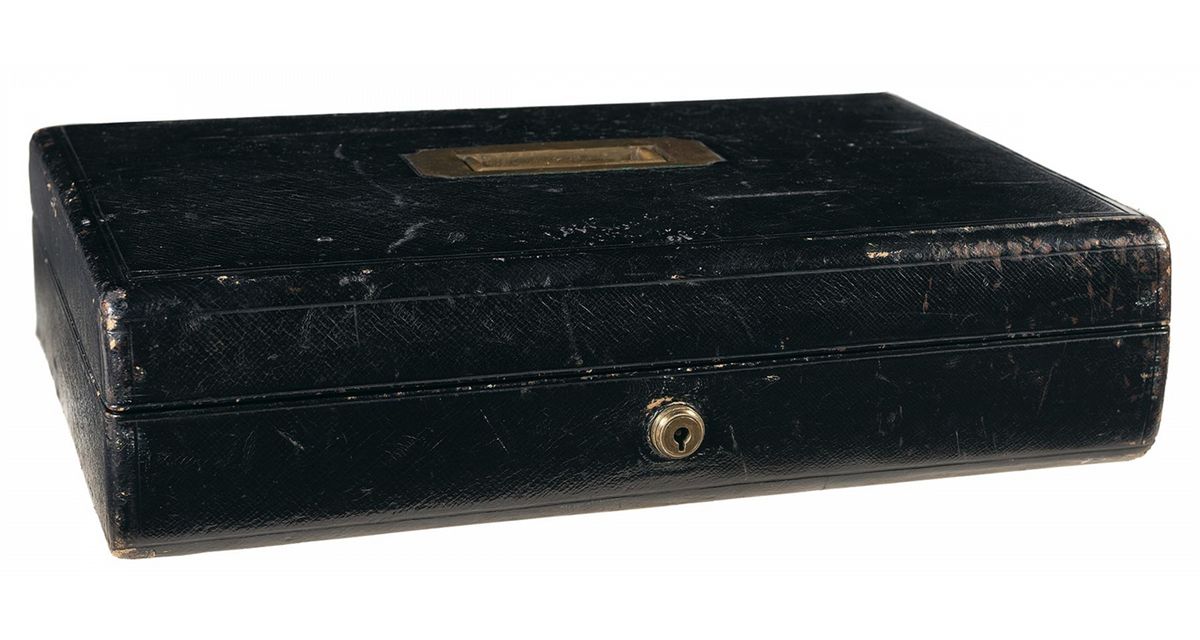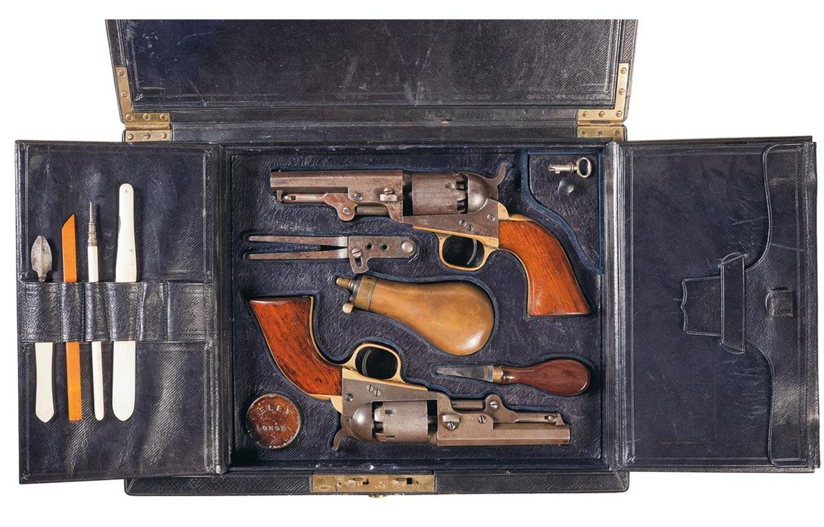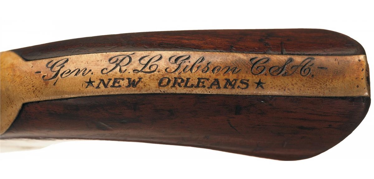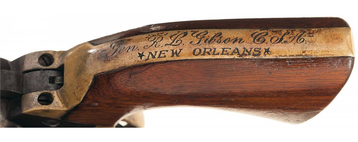 A) This lot consists of two Colt Model 1849 revolvers inscribed to Confederate General and U.S. Senator Randall Lee Gibson. The back strap on both revolvers is inscribed "Gen. R.L. Gibson C.S.A./New Orleans." Born at Spring Hill, Kentucky, on September 10, 1832, Randall Lee Gibson grew up on his father's plantation in Terrebonne parish. He graduated from Yale college in 1853 and went on to study law at the University of Louisiana in New Orleans. Gibson became heavily involved in the pro-secession faction of the Democratic Party and was an aide-de-camp to Governor Moore before entering the Confederate Army in March 1861 as a Captain in the First Louisiana Artillery. By the late summer of 1861, he was commissioned as a Colonel in the Thirteenth Louisiana Infantry. In April of 1862 Gibson and his men participated in the Hornet's Nest during the Battle of Shiloh. The Hornet's Nest was a position on the battlefield where Union forces held off fierce Confederate attacks. Ordered by General Braxton Bragg, Gibson led his brigade in three unsupported attacks on the Hornet's Nest. Union guns nearly destroyed Gibbon's brigade and his failure to overcome heavy Union fire resulted in Bragg calling Gibson "an arrant coward." Although the Union line ultimately collapsed at the Hornet's Nest, their sacrifice allowed General Grant time to regroup his scattered and retreating army and establish a new defense. Gibson went on to fight in the subsequent campaigns of the Army of Tennessee, which ended with the Battle of Spanish Fort. In January 1864, he was promoted to Brigadier General. He and his men fought with distinguish at the Spanish Fort. Leading a force of 2,500 men, Gibson was able to resist a siege until the last moment before escaping at night. Gen. Richard Taylor commented, "Gibson's stubborn defense and skillful retreat make this one of the best achievements of the war." After the war, Gibson practiced law at New Orleans until he was elected as a Louisiana Democrat in the House of Representatives in 1875 and then elected as a U.S. Senator in 1882 which he served as until his death in 1892. During his postbellum political career, Gibson deplored the gap between the rich and poor, fought for a reformist public school agenda that included federal funding, petitioned for levee construction and other flood control measures, and sought common ground between the extreme political positions of his era. The "A" revolver was manufactured in 1864 and the "B" revolver was manufactured in 1868. Standard one line New York barrel address on the top barrel flat, "COLTS/PATENT" on the left side of the frame (this marking is double stamped on the "A" revolver), "31 CAL" on the trigger guard and the stagecoach holdup scene roll-engraved on the cylinder. The left side of the barrel lug is marked with "crown/V' and "crown/GP" proof marks with the two alternating between each chamber on the cylinder. The matching serial number is marked on the barrel, frame, trigger guard and back strap with the partial serial number on the barrel wedge, cylinder and arbor pin. Blue finish with casehardened hammer, frame and loading lever and fitted with a smooth one piece varnished walnut grip. The revolvers are cased in a leatherette English lap desk with accessories. The top of the case has a folding brass handle and the interior has a lid compartment cover marked "W. LEUCHARS/38 PICADILLY LONDON." The brass circular turn lock has the W. Leuchars marking along with "M/592." There is a side compartment containing an ink case, a light case, and a Leroy W. Fairchild pen with case. The main compartment has folding covers featuring a silk line portfolio with the other side retaining three ivory mounted writing tools. The French style navy blue velvet fitted interior retains the two revolvers, an unmarked powder flask, a steel Colt's patent two cavity bullet mold, a screwdriver and an Eley cap tin. With this lot is a Gibbon's official Presidential pardon which is dated Sept. 25, 1866. The pardon has been laminated.