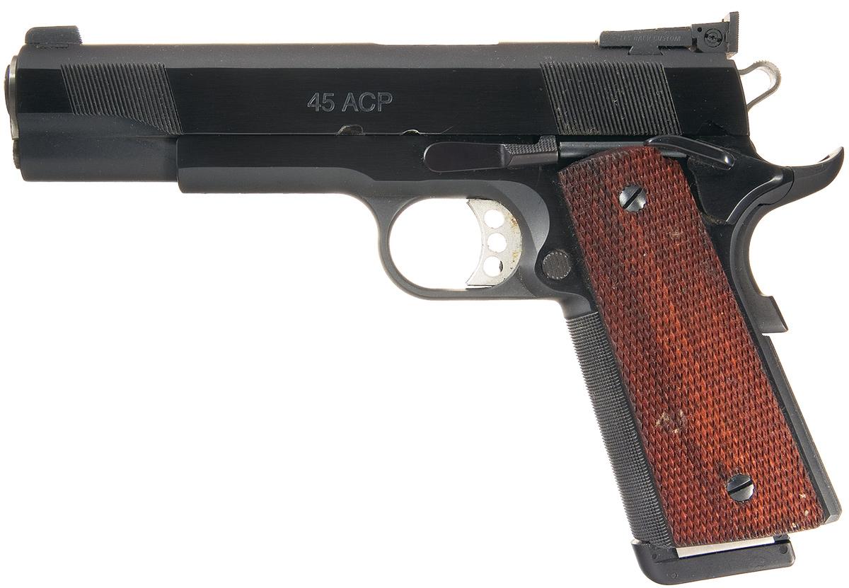 Features an adjustable rear sight, front and rear slide serrations, a match barrel, ambidextrous safety, a lowered and flared ejection port and beveled magazine well. Adjustable trigger and checkered front strap. The slide is marked "45 ACP" on the left with "BAER/CUSTOM" on the right. The frame has the two line address on the left over the serial number. Complete with the original box numbered to the gun, and a locking hardwood case with a screw driver two allen wrenches and a snap cap.