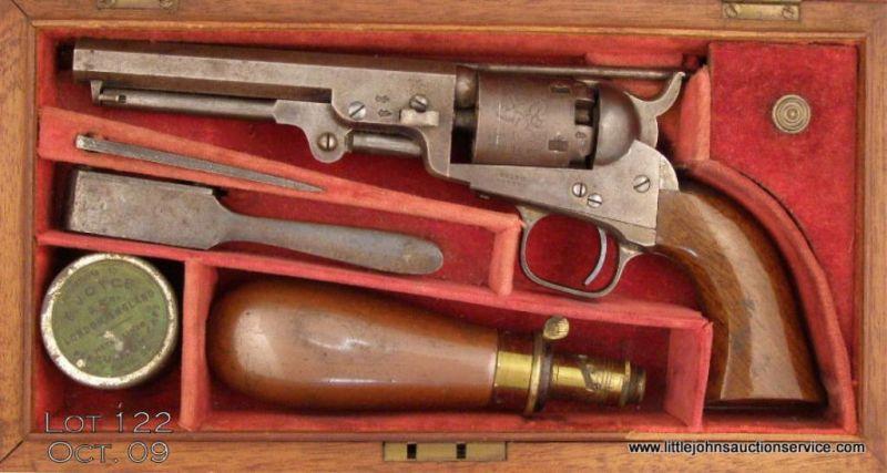 Cased London Colt Model 1849 percussion revolver,  .31 cal., blue and case hardened finish, wood  grips, #5893. This gun is in overall very good  condition showing all matching visible serial  numbers including the wedge; traces of blue inprotected areas of the barrel assembly, 98%  cylinder scene remaining, traces of case colors on  frame, very good bore, action, markings and  grips; iron back strap, British proofed. The box  is in overall very good to excellent conditionshowing complete red lining with just a couple  scattered compressions and some slight tattering;  included is an English bag shaped brass powder  flask, iron bullet mold, nipple wrench, cleaning  rod, cap tin and key to case lock.  Est.:$2,000-$4,000.