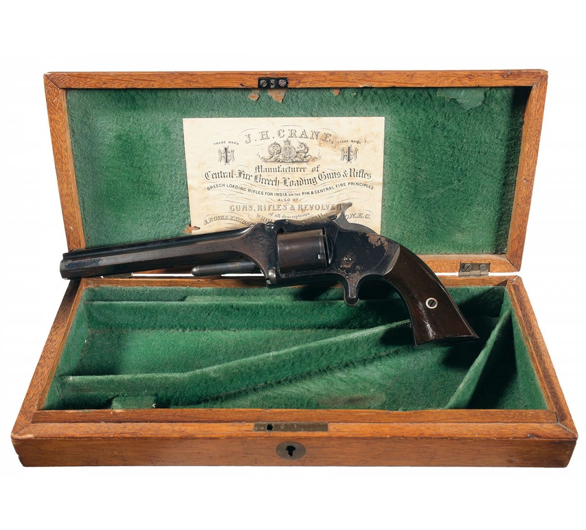 Manufactured from 1861 to 1874 with this late production example having a London retailer marking hand engraved on the back strap. The top of the barrel rib has the one line Springfield address and the cylinder has the patent dates marking. The cylinder is also stamped with alternating British proofs between the chambers. The back strap is inscribed "J.H. CRANE, Sole Agent , 3 ROYAL EXCHANGE LONDON". Matching assembly number stamped on the barer lug and cylinder. Fitted with smooth grips with the right panel numbered to the gun. The matching London retailer partitioned wooden case is lined in green felt and the inside of the lid has a J.H. Crane retailer label.