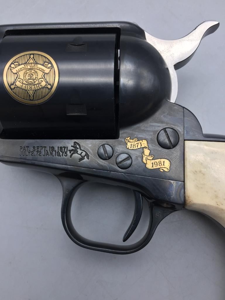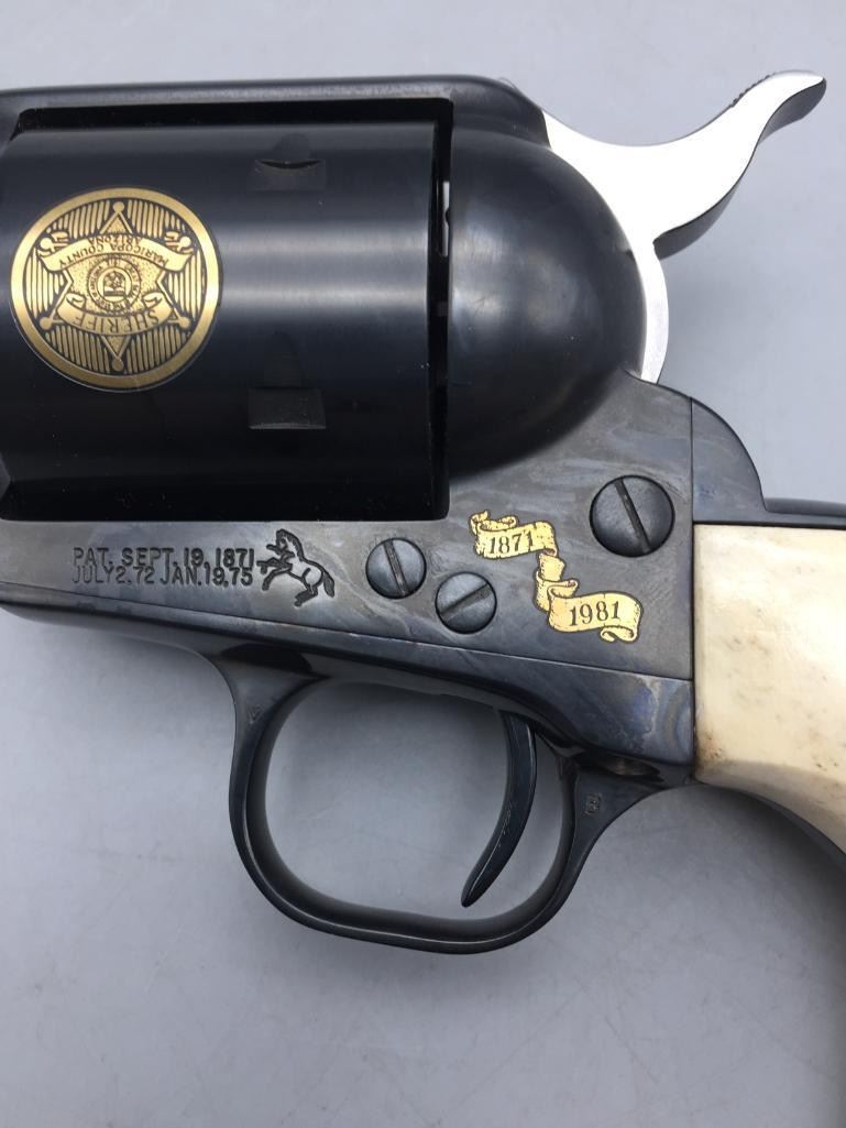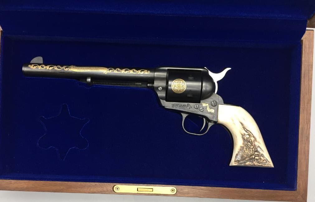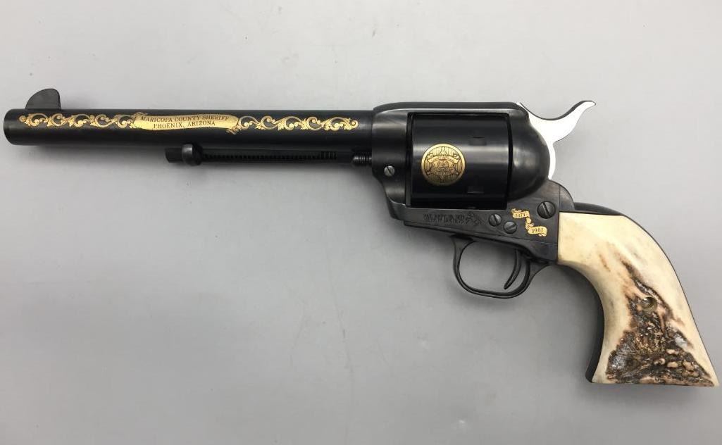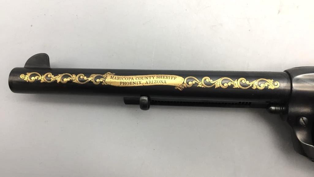 For your consideration we offer for sale this commemorative Maricopa County Sheriff’s Colt, single action army revolver in a .45 caliber with a gorgeous presentation wooden case and badge. It comes with its original boxes. The packaging shows use, as would be expected, but the firearm is like new. Maker: Colt. Serial No. 93030SA. Size: Barrel measures 7.5 inches. Age: Circa 1981. Please look closely at the pictures - they are an important part of our description. Shipping: There will be a $5 handling / packaging fee for shipping this lot. The actual cost of postage will be added on top of that. *****This firearm requires an FFL Transfer*****