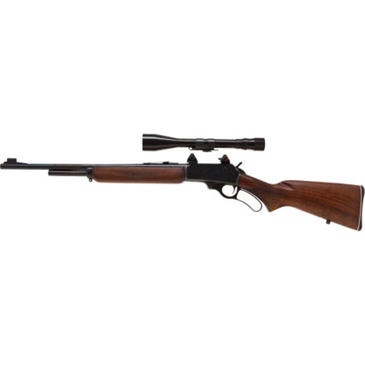 Cased Marlin Model 336SC Lever Action Sporting Carbine. Serial No. P3361, .35 Remington, 20-inch barrel with hooded ramp front sight and adjustable rear sight. 2/3 magazine. Barrel marked MICRO-GROOVE. Blued finish with checkered walnut pistolgrip stock. Scope mounts on receiver. Sold together with loose Bausch & Lomb 8A telescopic sight. Sling swivel hardware present. Contained in custom gun case.Condition: Very good. Retaining approximately 80% finish with most of the loses to barrel and magazine. Rear sight is bent. Light surface rust to finish and mostly noticeable on hooded sight, numerous dings and scratches to finish and stocks. Optics are clear. Bore is good, needs cleaning. NRA FIREARMS FOR FREEDOM PROGRAM