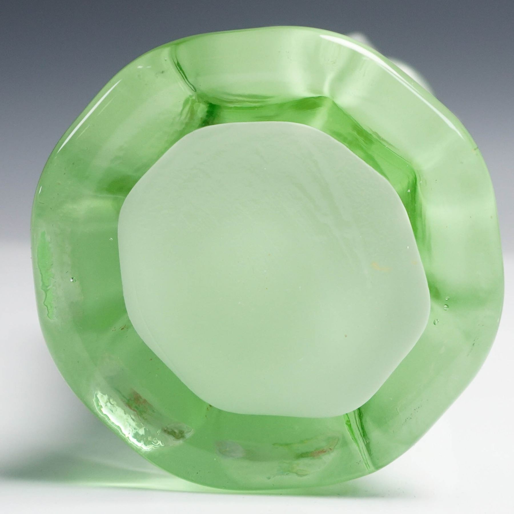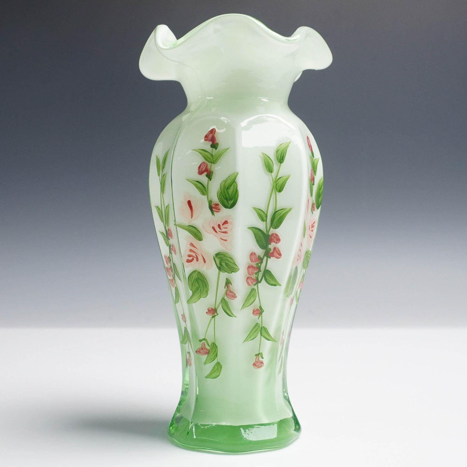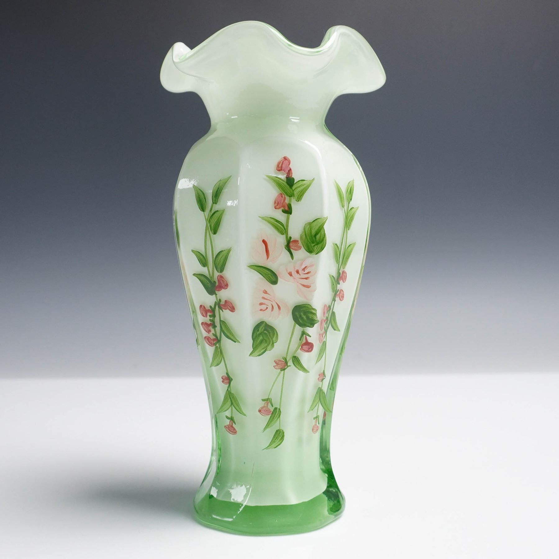 Delicate cased art glass vase featuring a ruffled rim and soft milk green coloring with a clear green foot. The body is hand painted with elegant pink rose blossoms and green foliage, arranged in vertical sprays. The interior white casing enhances the pastel effect of the exterior design. While unmarked, the form, coloring, and decoration are stylistically similar to pieces produced by Fenton Art Glass. Measures 8"H.