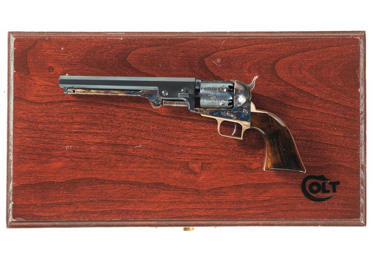 This is one of 3,500 produced fully functional, non firing, fine quality 1:2.125 scale miniatures of the Colt 1951 Navy revolver. Complete with a velvet lined walnut Colt case with interior brass identification plaque. Excellent.