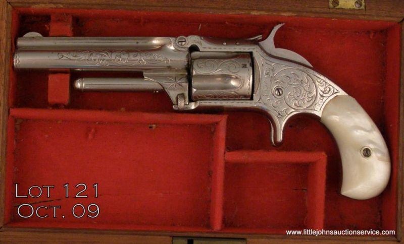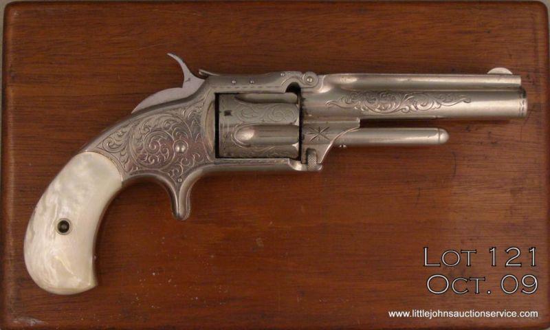 Cased New York style engraved Smith & Wesson New Model 1-1/2 spur trigger revolver, .32 cal., 3-1/2” barrel, nickel finish, pearl grips, #103266. This gun is in overall very good to excellent condition showing approx. 97% of thenickel finish that likely was period finished on the gun at the time of engraving; good bore, good action, very good iridescent pearl grips. The wood case is lined in a bright reddish material with some mothing and slight tattering; no accessorie exterior of the box is overall very good with scattered nicks and mars from storage and both brass lid tabs are present. Est.: $1,500-$3,000.