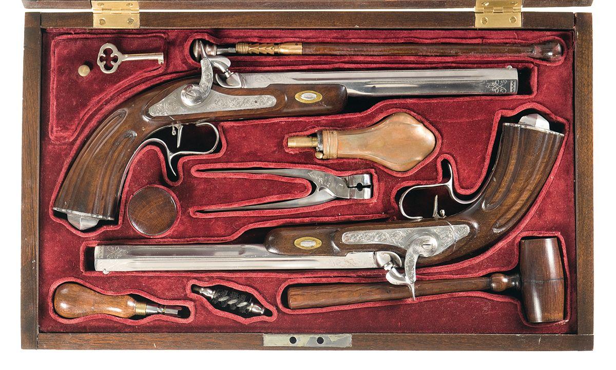 A) Blade and adjustable notch sights, scroll engraving, finger rest trigger guard, fluted grip and metal grip cap. In French-cut case with ramrod, cleaning rod, powder flask, bullet mold, hammer, barrel brush and nipple wrench.