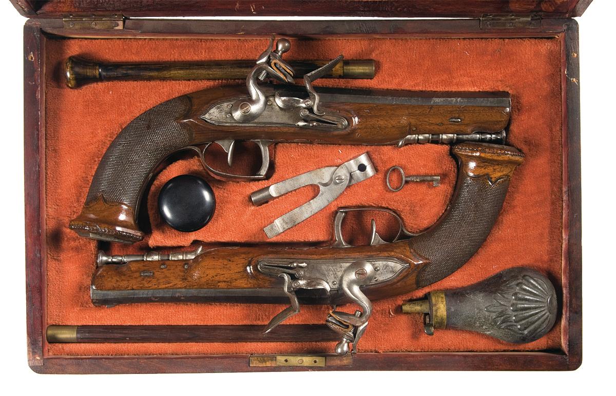 A) This is a cased pair of Belgian flintlock dueling pistols with each pistol featuring a different engraving on the trigger guard and buttcap. Both pistol feature a rifled barrel that has a decorative streak blue finish, with the remaining surfaces appearing to be originally bright. The left barrel flat is stamped with a Liege ELG proof on the left flat and gold highlighted stamped proofs on the upper left and right and top flats. Fixed sights, iron ramrod with flat head, iron ramrod pipes, and plain lock. The upper tang, side plates and trigger guard finial are engraved. The stock has a blank silver oval initial plate on the left flat and a finely checkered grip with flared butt. A carved dot line motif is featured on the back of the grip and on the edges of the flared butt. The buttcap has an engraved bird in a tree scene and a dog in a field scene on the trigger guard. Complete with a modern wooden case lined in red felt. Included are the items: powder flask, single conical bullet mold, key, wooden cap box, and two dissimilar wooden ramrods.