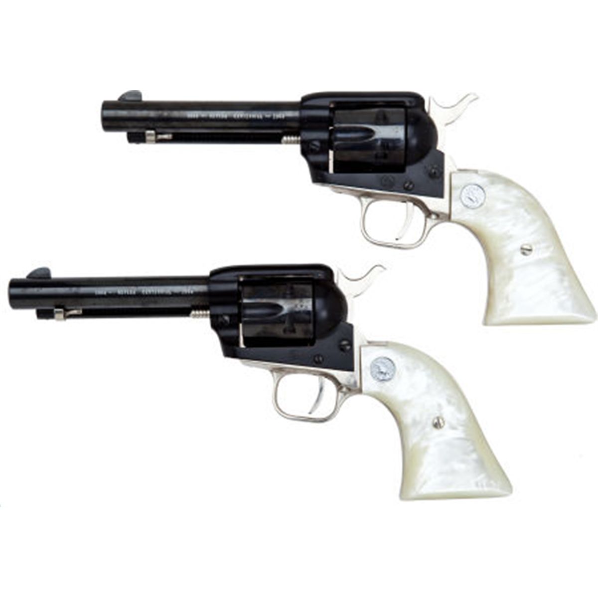 Cased Pair of Colt Nevada Centennial Frontier Scout Single Action Revolvers. Comprising: 1) Serial no. 3655NS, .22 caliber, 4 3/4-inch barrel with Nevada Centennial legend. Blued and nickel-plated finish. Faux pearl grips with Colt medallions. 2) Serial no. 3656NS, .22 caliber, 4 3/4-inch barrel with Nevada Centennial legend. Blued and nickel-plated finish. Faux pearl grips with Colt medallions. Scrollwork engraving on the butts. Both contained in Colt factory hardwood box with wagon train scene on the top. Interior with white and blue lining with Rampant Colt on inside of lid. Condition: Excellent. Revolvers with only minor handling wear. Box is very good but with two inch crack in the lid. NRA FIREARMS FOR FREEDOM PROGRAM